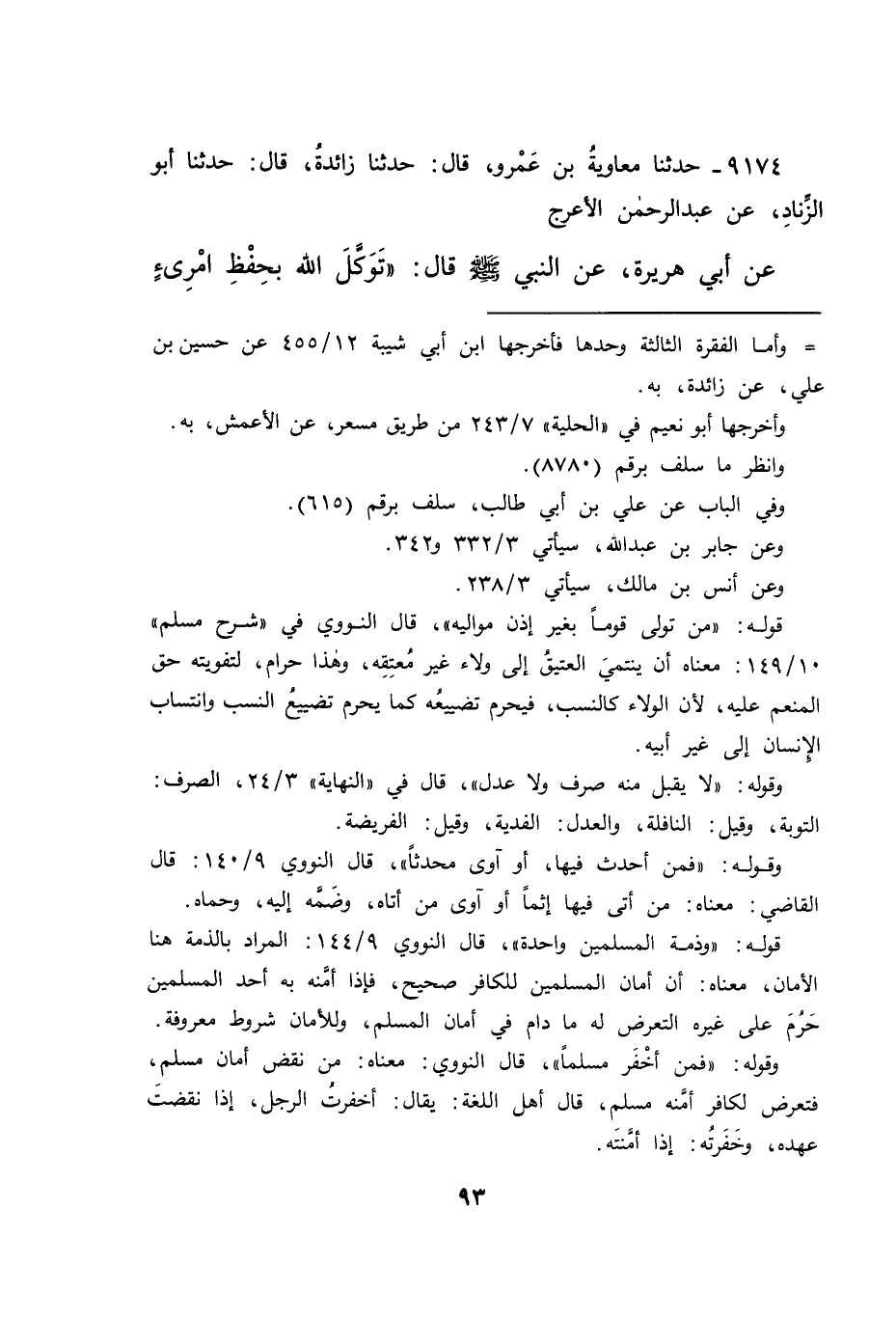٩١٧٤ - حَدَّثَنَا مُعَاوِيَةُ بْنُ عَمْرٍو، قَالَ: حَدَّثَنَا زَائِدَةُ، قَالَ: حَدَّثَنَا أَبُو الزِّنَادِ، عَنْ عَبْدِ الرَّحْمَنِ الْأَعْرَجِ، عَنْ أَبِي هُرَيْرَةَ، عَنِ النَّبِيِّ صَلَّى اللهُ عَلَيْهِ وَسَلَّمَ قَالَ: " تَوَكَّلَ اللهُ بِحِفْظِ امْرِئٍ