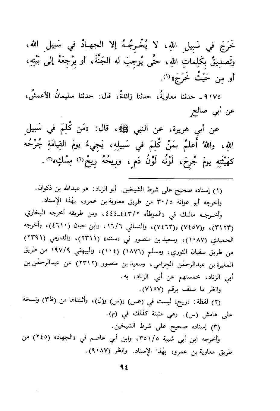 ٩١٧٥ - حَدَّثَنَا مُعَاوِيَةُ، حَدَّثَنَا زَائِدَةُ، قَالَ: حَدَّثَنَا سُلَيْمَانُ الْأَعْمَشُ، عَنْ أَبِي صَالِحٍ، عَنْ أَبِي هُرَيْرَةَ، عَنِ النَّبِيِّ صَلَّى اللهُ عَلَيْهِ وَسَلَّمَ قَالَ: " مَنْ كُلِمَ فِي سَبِيلِ اللهِ، وَاللهُ أَعْلَمُ بِمَنْ كُلِمَ فِي سَبِيلِهِ، يَجِيءُ يَوْمَ الْقِيَامَةِ جُرْحُهُ كَهَيْئَتِهِ يَوْمَ جُرِحَ، لَوْنُهُ لَوْنُ دَمٍ، وَرِيحُهُ رِيحُ (٢) مِسْكٍ " (٣)
