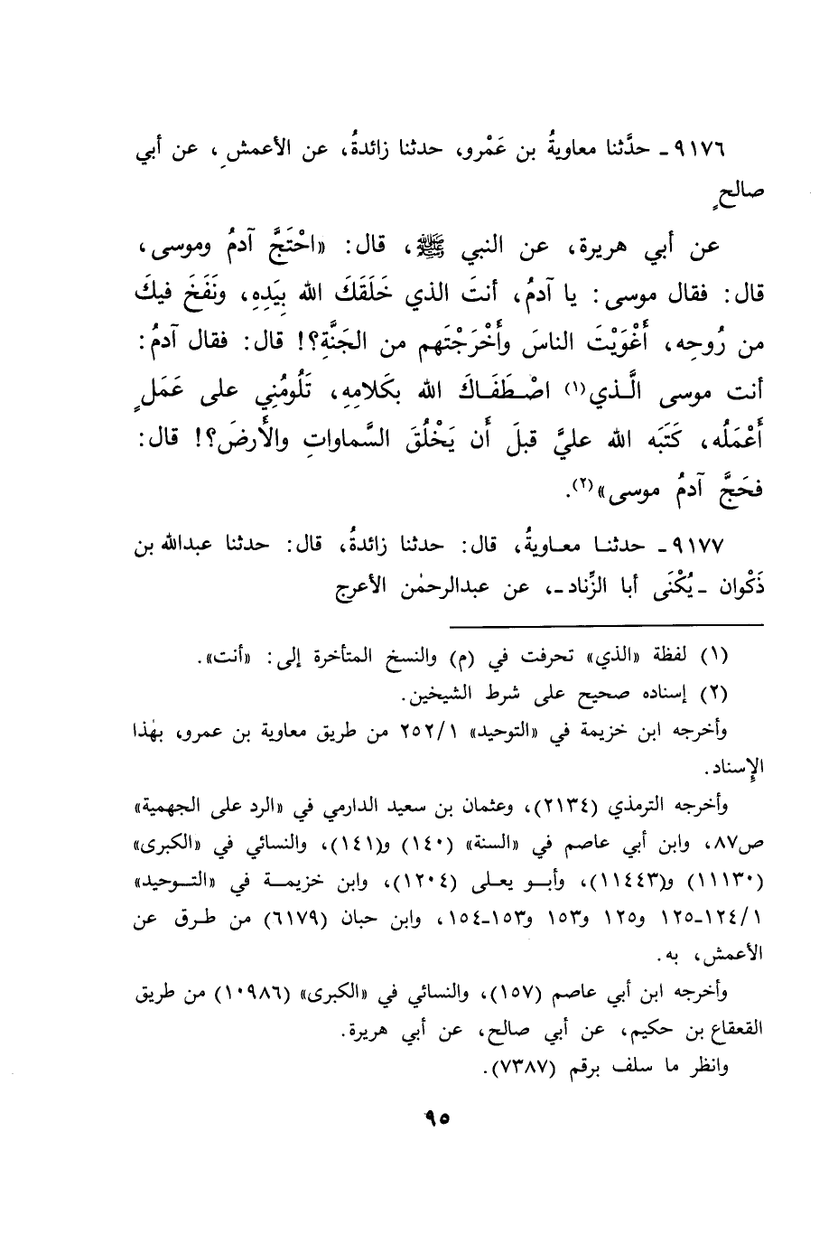 ٩١٧٦ - حَدَّثَنَا مُعَاوِيَةُ بْنُ عَمْرٍو، حَدَّثَنَا زَائِدَةُ، عَنِ الْأَعْمَشِ، عَنْ أَبِي صَالِحٍ، عَنْ أَبِي هُرَيْرَةَ، عَنِ النَّبِيِّ صَلَّى اللهُ عَلَيْهِ وَسَلَّمَ قَالَ: " احْتَجَّ آدَمُ وَمُوسَى، قَالَ: فَقَالَ مُوسَى: يَا آدَمُ، أَنْتَ الَّذِي خَلَقَكَ اللهُ بِيَدِهِ، وَنَفَخَ فِيكَ مِنْ رُوحِهِ، أَغْوَيْتَ النَّاسَ وَأَخْرَجْتَهُمْ مِنَ الْجَنَّةِ، قَالَ: فَقَالَ آدَمُ: أَنْتَ مُوسَى الَّذِي (١) اصْطَفَاكَ اللهُ بِكَلَامِهِ، تَلُومُنِي عَلَى عَمَلٍ أَعْمَلُهُ، كَتَبَهُ اللهُ عَلَيَّ قَبْلَ أَنْ يَخْلُقَ السَّمَاوَاتِ وَالْأَرْضَ، قَالَ: فَحَجَّ آدَمُ مُوسَى " (٢)