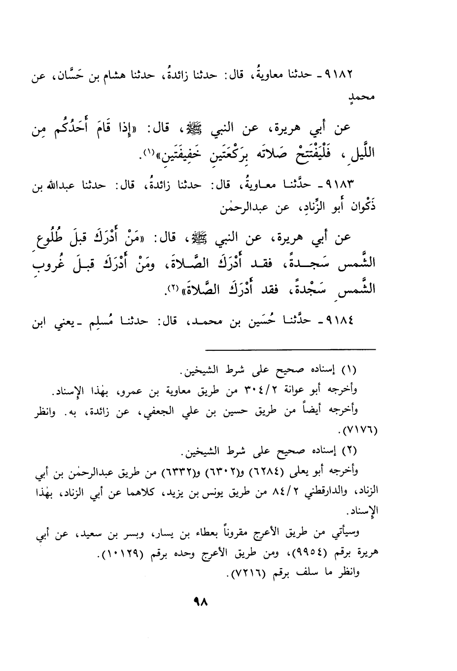 ٩١٨٣ - حَدَّثَنَا مُعَاوِيَةُ، قَالَ: حَدَّثَنَا زَائِدَةُ، قَالَ: حَدَّثَنَا عَبْدُ اللهِ بْنُ ذَكْوَانَ أَبُو الزِّنَادِ، عَنْ عَبْدِ الرَّحْمَنِ، عَنْ أَبِي هُرَيْرَةَ، عَنِ النَّبِيِّ صَلَّى اللهُ عَلَيْهِ وَسَلَّمَ قَالَ: " مَنْ أَدْرَكَ قَبْلَ طُلُوعِ الشَّمْسِ سَجْدَةً، فَقَدْ أَدْرَكَ الصَّلَاةَ، وَمَنْ أَدْرَكَ قَبْلَ غُرُوبِ الشَّمْسِ سَجْدَةً، فَقَدْ أَدْرَكَ الصَّلَاةَ " (٢)
