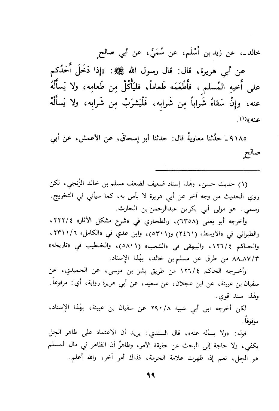 خَالِدٍ، عَنْ زَيْدِ بْنِ أَسْلَمَ، عَنْ سُمَيٍّ، عَنْ أَبِي صَالِحٍ، عَنْ أَبِي هُرَيْرَةَ، قَالَ: قَالَ رَسُولُ اللهِ صَلَّى اللهُ عَلَيْهِ وَسَلَّمَ: " إِذَا دَخَلَ أَحَدُكُمْ عَلَى أَخِيهِ الْمُسْلِمِ، فَأَطْعَمَهُ طَعَامًا، فَلْيَأْكُلْ مِنْ طَعَامِهِ، وَلَا يَسْأَلْهُ عَنْهُ، وَإِنْ سَقَاهُ شَرَابًا مِنْ شَرَابِهِ، فَلْيَشْرَبْ مِنْ شَرَابِهِ، وَلَا يَسْأَلْهُ عَنْهُ " (١)