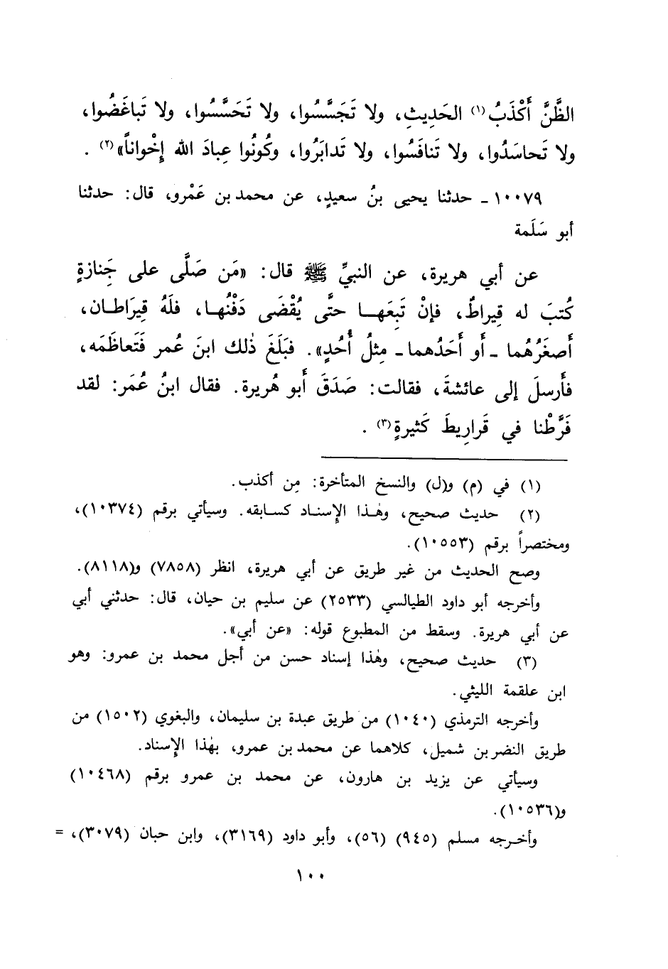 ١٠٠٧٩ - حَدَّثَنَا يَحْيَى بْنُ سَعِيدٍ، عَنْ مُحَمَّدِ بْنِ عَمْرٍو، قَالَ: حَدَّثَنَا أَبُو سَلَمَةَ، عَنِ أَبِي هُرَيْرَةَ، عَنِ النَّبِيِّ صَلَّى اللهُ عَلَيْهِ وَسَلَّمَ قَالَ: " مَنْ صَلَّى عَلَى جَنَازَةٍ كُتِبَ لَهُ قِيرَاطٌ، فَإِنْ تَبِعَهَا حَتَّى يُقْضَى دَفْنُهَا، فَلَهُ قِيرَاطَانِ، أَصْغَرُهُمَا - أَوْ أَحَدُهُمَا - مِثْلُ أُحُدٍ "، فَبَلَغَ ذَلِكَ ابْنَ عُمَرَ فَتَعَاظَمَهُ، فَأَرْسَلَ إِلَى عَائِشَةَ، فَقَالَتْ: صَدَقَ أَبُو هُرَيْرَةَ، فَقَالَ ابْنُ عُمَرَ: " لَقَدْ فَرَّطْنَا فِي قَرَارِيطَ كَثِيرَةٍ " (٣)