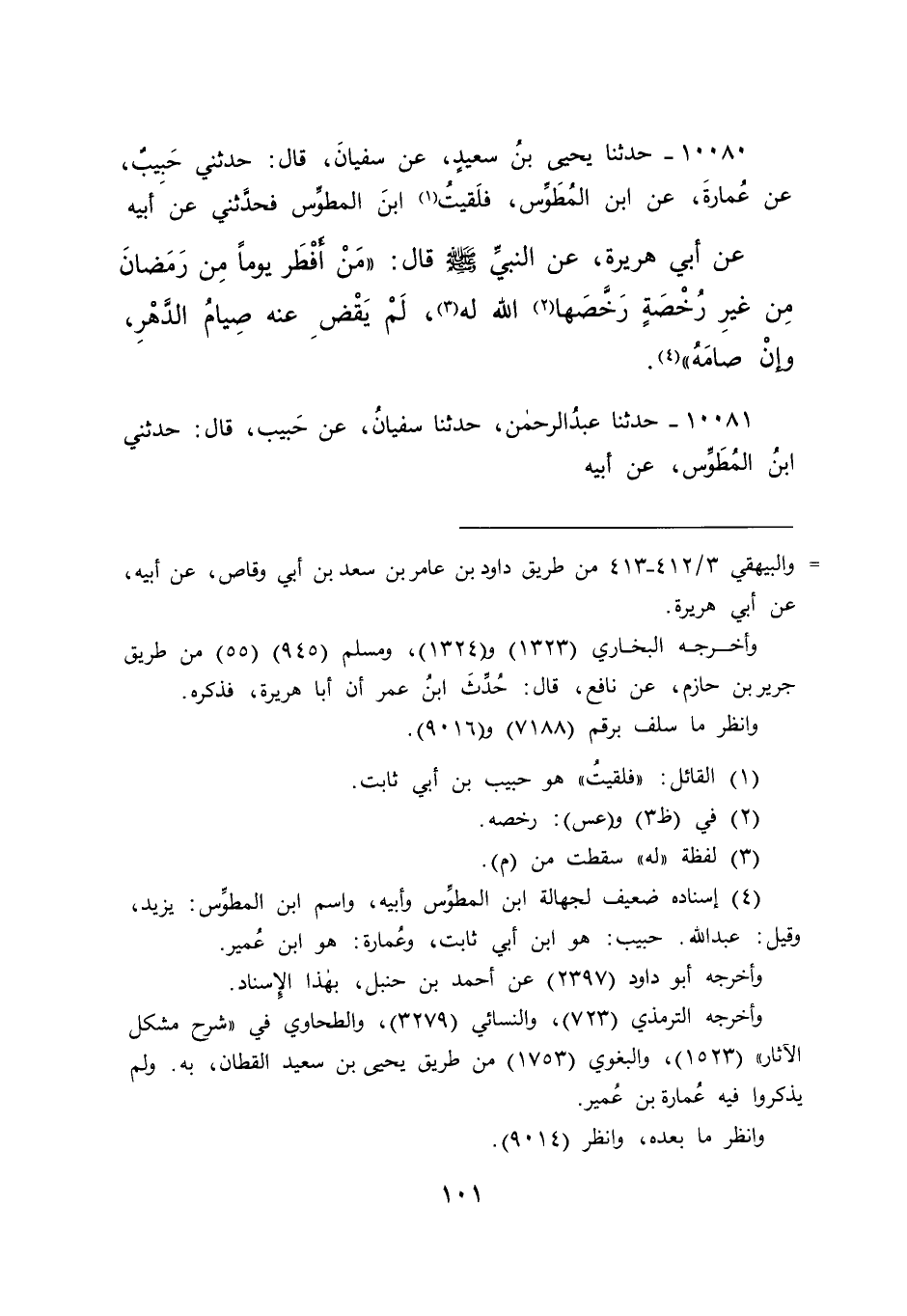 ١٠٠٨٠ - حَدَّثَنَا يَحْيَى بْنُ سَعِيدٍ، عَنْ سُفْيَانَ، قَالَ: حَدَّثَنِي حَبِيبٌ، عَنْ عُمَارَةَ، عَنِ ابْنِ الْمُطَوِّسِ، فَلَقِيتُ (١) ابْنَ الْمُطَوِّسِ، فَحَدَّثَنِي عَنِ أَبِيهِ، عَنِ أَبِي هُرَيْرَةَ، عَنِ النَّبِيِّ صَلَّى اللهُ عَلَيْهِ وَسَلَّمَ قَالَ: " مَنْ أَفْطَرَ يَوْمًا مِنْ رَمَضَانَ مِنْ غَيْرِ رُخْصَةٍ رَخَّصَهَا (٢) اللهُ لَهُ (٣) ، لَمْ يَقْضِ عَنْهُ صِيَامُ الدَّهْرِ، وَإِنْ صَامَهُ " (٤)