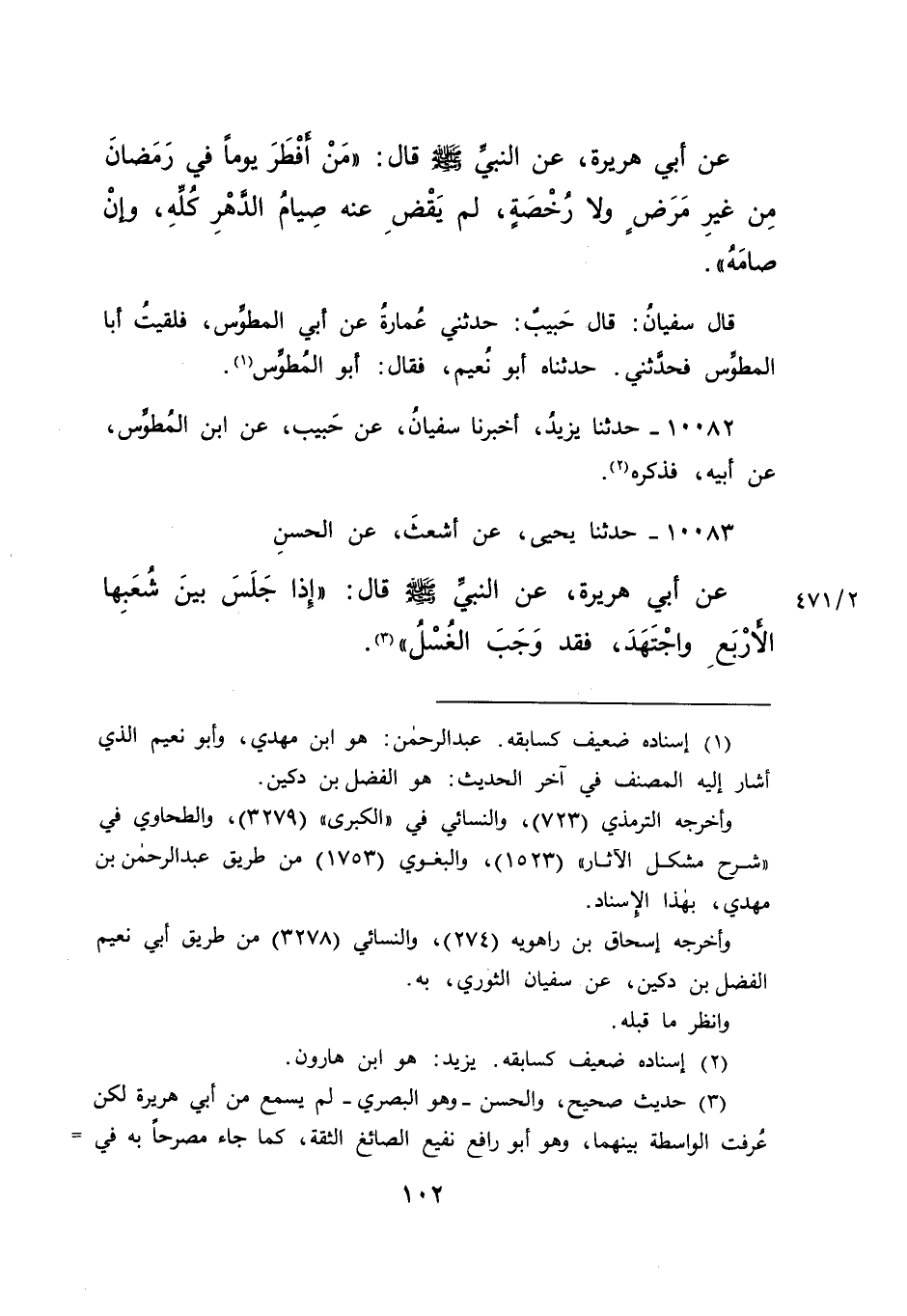 ١٠٠٨٣ - حَدَّثَنَا يَحْيَى، عَنِ أَشْعَثَ، عَنِ الْحَسَنِ، عَنِ أَبِي هُرَيْرَةَ، عَنِ النَّبِيِّ صَلَّى اللهُ عَلَيْهِ وَسَلَّمَ قَالَ: " إِذَا جَلَسَ بَيْنَ شُعَبِهَا الْأَرْبَعِ وَاجْتَهَدَ، فَقَدْ وَجَبَ الْغُسْلُ " (٣)