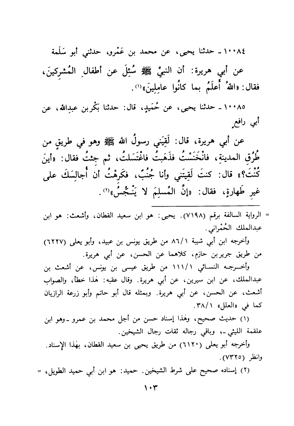 ١٠٠٨٥ - حَدَّثَنَا يَحْيَى، عَنْ حُمَيْدٍ، قَالَ: حَدَّثَنَا بَكْرُ بْنُ عَبْدِ اللهِ، عَنِ أَبِي رَافِعٍ، عَنِ أَبِي هُرَيْرَةَ، قَالَ: لَقِيَنِي رَسُولُ اللهِ صَلَّى اللهُ عَلَيْهِ وَسَلَّمَ وَهُوَ فِي طَرِيقٍ مِنْ طُرُقِ الْمَدِينَةِ، فَانْخَنَسْتُ فَذَهَبْتُ فَاغْتَسَلْتُ، ثُمَّ جِئْتُ، فَقَالَ: " أَيْنَ كُنْتَ؟ " قَالَ: كُنْتَ لَقِيتَنِي وَأَنَا جُنُبٌ، فَكَرِهْتُ أَنْ أُجَالِسَكَ عَلَى غَيْرِ طَهَارَةٍ، فَقَالَ " إِنَّ الْمُسْلِمَ لَا يَنْجُسُ " (٢)