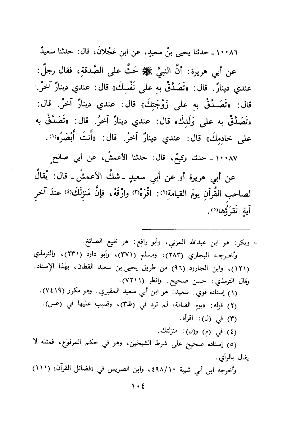 ١٠٠٨٦ - حَدَّثَنَا يَحْيَى بْنُ سَعِيدٍ، عَنِ ابْنِ عَجْلَانَ، قَالَ: حَدَّثَنَا سَعِيدٌ، عَنِ أَبِي هُرَيْرَةَ، أَنَّ النَّبِيَّ صَلَّى اللهُ عَلَيْهِ وَسَلَّمَ حَثَّ عَلَى الصَّدَقَةِ، فَقَالَ رَجُلٌ: عِنْدِي دِينَارٌ، قَالَ: " تَصَدَّقْ بِهِ عَلَى نَفْسِكَ "، قَالَ: عِنْدِي دِينَارٌ آخَرُ، قَالَ: " تَصَدَّقْ بِهِ عَلَى زَوْجَتِكَ "، قَالَ: عِنْدِي دِينَارٌ آخَرُ، قَالَ: " تَصَدَّقْ بِهِ عَلَى وَلَدِكَ "، قَالَ: عِنْدِي دِينَارٌ آخَرُ، قَالَ: " تَصَدَّقْ بِهِ عَلَى خَادِمِكَ "، قَالَ: عِنْدِي دِينَارٌ آخَرُ، قَالَ: " أَنْتَ أَبْصَرُ " (١)