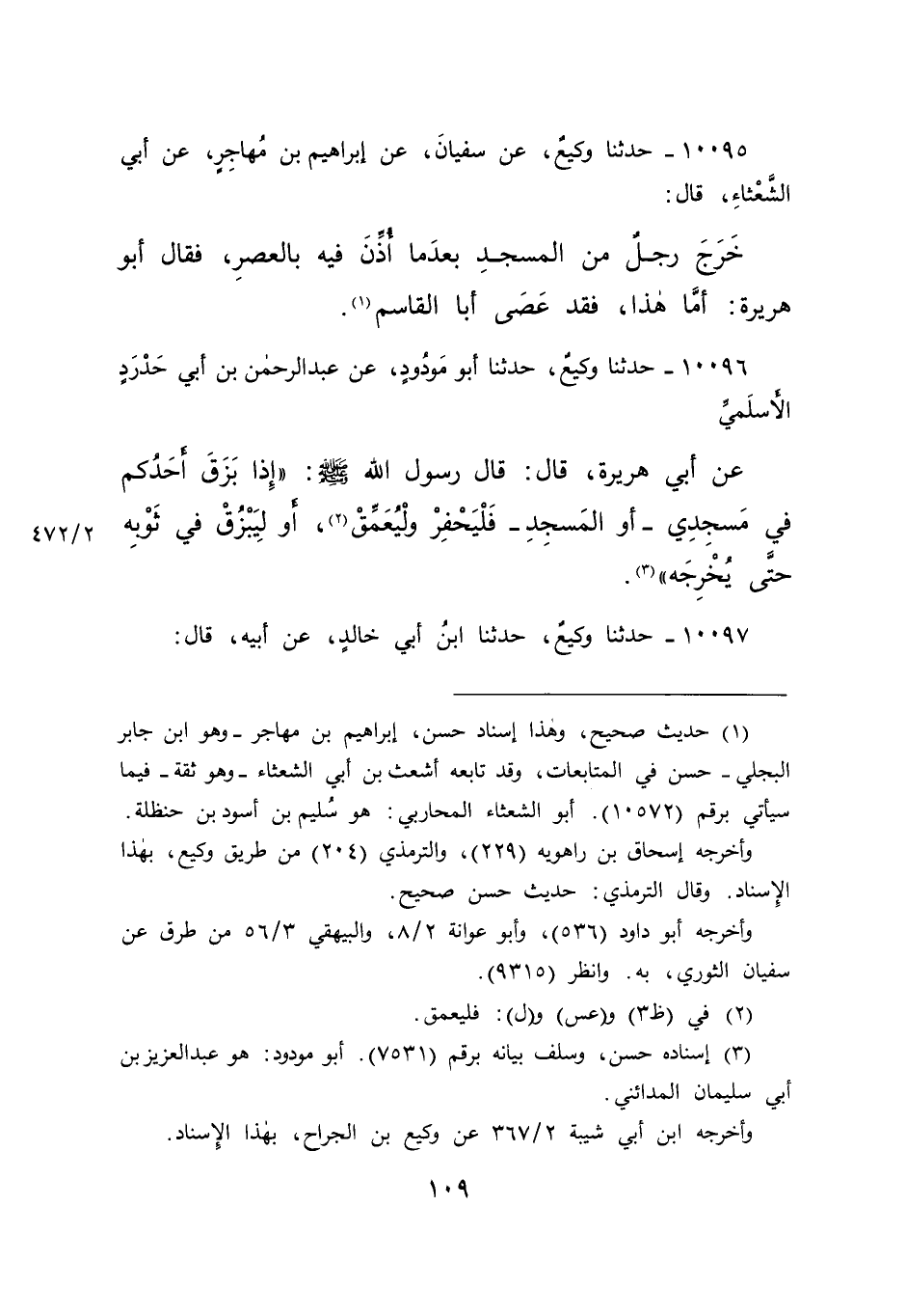 ١٠٠٩٥ - حَدَّثَنَا وَكِيعٌ، عَنْ سُفْيَانَ، عَنِ إِبْرَاهِيمَ بْنِ مُهَاجِرٍ، عَنِ أَبِي الشَّعْثَاءِ، قَالَ: خَرَجَ رَجُلٌ مِنَ الْمَسْجِدِ بَعْدَ مَا أُذِّنَ فِيهِ بِالْعَصْرِ، فَقَالَ أَبُو هُرَيْرَةَ: " أَمَّا هَذَا، فَقَدْ عَصَى أَبَا الْقَاسِمِ " (١)