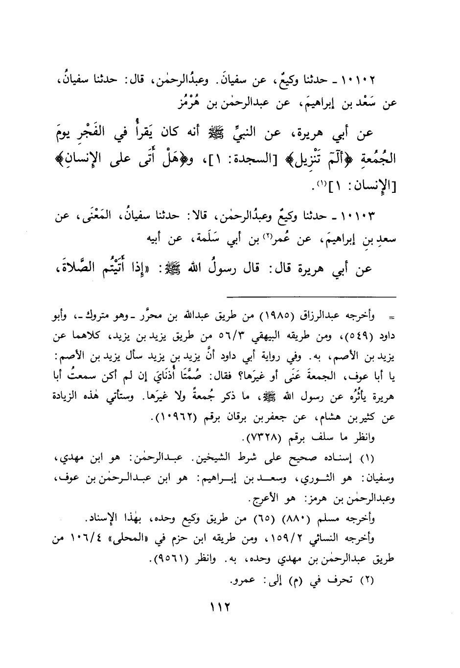 ١٠١٠٢ - حَدَّثَنَا وَكِيعٌ، عَنْ سُفْيَانَ، وَعَبْدُ الرَّحْمَنِ، قَالَ: حَدَّثَنَا سُفْيَانُ، عَنْ سَعْدِ بْنِ إِبْرَاهِيمَ، عَنْ عَبْدِ الرَّحْمَنِ بْنِ هُرْمُزَ، عَنِ أَبِي هُرَيْرَةَ، عَنِ النَّبِيِّ صَلَّى اللهُ عَلَيْهِ وَسَلَّمَ: " أَنَّهُ كَانَ يَقْرَأُ فِي الْفَجْرِ يَوْمَ الْجُمُعَةِ {الم تَنْزِيلُ} [السجدة:١] وَ {هَلْ أَتَى عَلَى الْإِنْسَانِ} [الإنسان:١] (١)