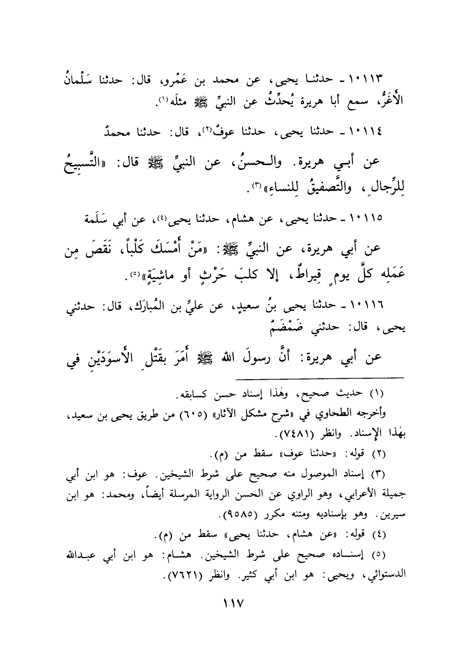 ١٠١١٥ - حَدَّثَنَا يَحْيَى، عَنِ هِشَامٍ، حَدَّثَنَا يَحْيَى (٤) ، عَنْ أَبِي سَلَمَةَ، عَنْ أَبِي هُرَيْرَةَ، عَنِ النَّبِيِّ صَلَّى اللهُ عَلَيْهِ وَسَلَّمَ: " مَنْ أَمْسَكَ كَلْبًا، نَقَصَ مِنْ عَمَلِهِ كُلَّ يَوْمٍ قِيرَاطٌ، إِلَّا كَلْبَ حَرْثٍ أَوْ مَاشِيَةٍ " (٥)