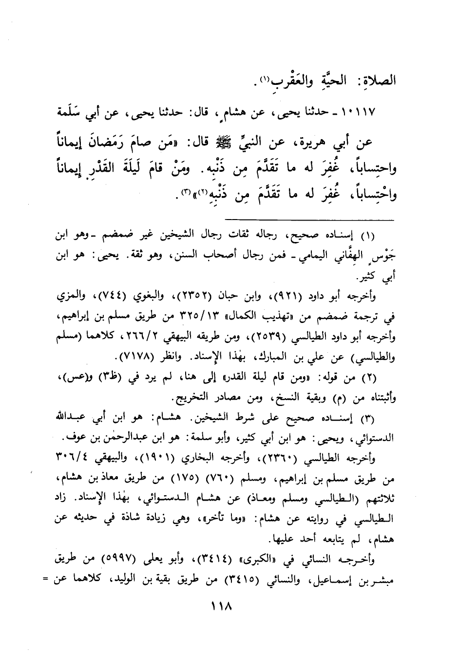 ١٠١١٧ - حَدَّثَنَا يَحْيَى، عَنْ هِشَامٍ، قَالَ: حَدَّثَنَا يَحْيَى، عَنِ أَبِي سَلَمَةَ، عَنِ أَبِي هُرَيْرَةَ، عَنِ النَّبِيِّ صَلَّى اللهُ عَلَيْهِ وَسَلَّمَ قَالَ: " مَنْ صَامَ رَمَضَانَ إِيمَانًا وَاحْتِسَابًا، غُفِرَ لَهُ مَا تَقَدَّمَ مِنْ ذَنْبِهِ، وَمَنْ قَامَ لَيْلَةَ الْقَدْرِ إِيمَانًا وَاحْتِسَابًا، غُفِرَ لَهُ مَا تَقَدَّمَ مِنْ ذَنْبِهِ (٢) "، (٣)