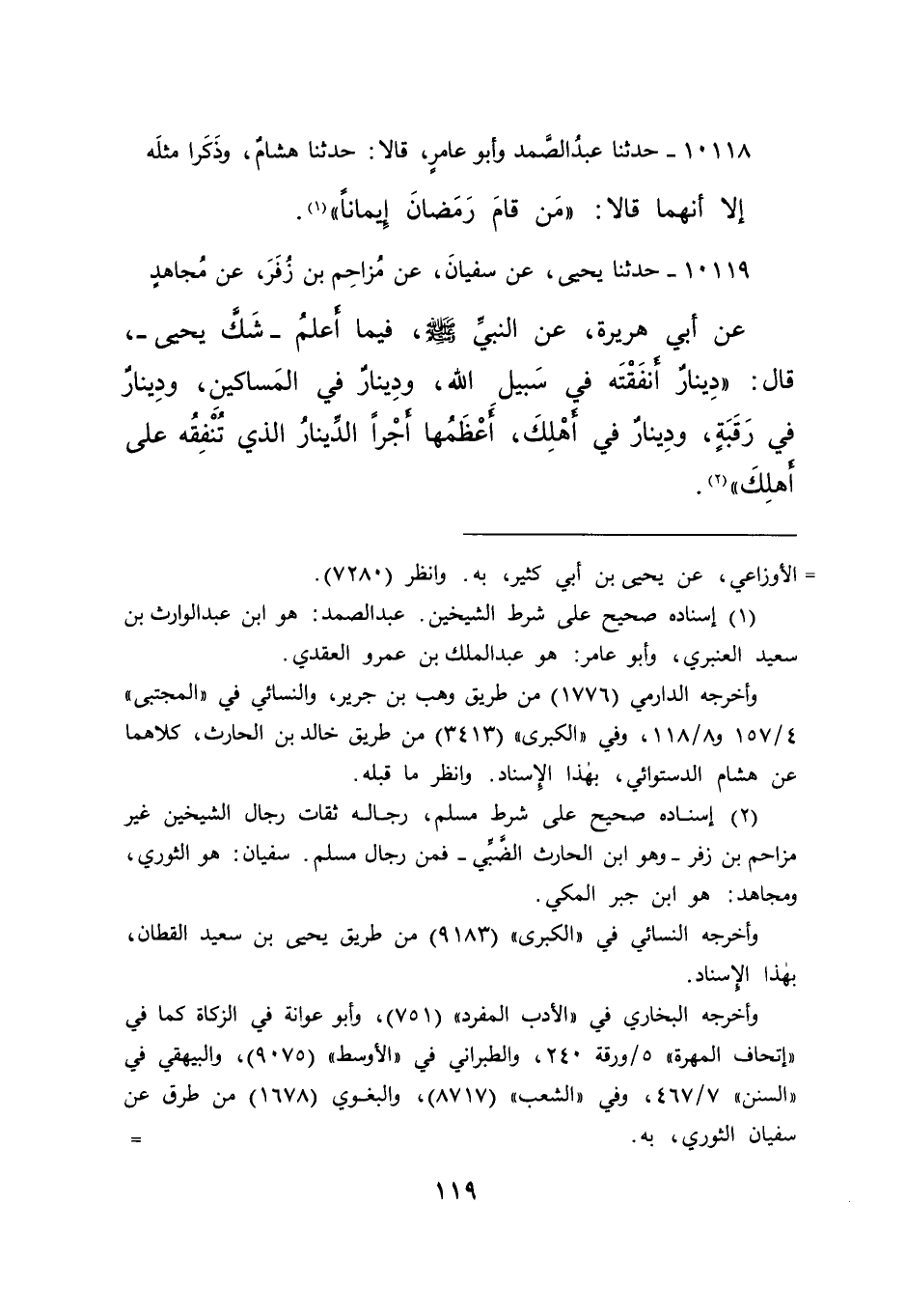 ١٠١١٩ - حَدَّثَنَا يَحْيَى، عَنْ سُفْيَانَ، عَنْ مُزَاحِمِ بْنِ زُفَرَ، عَنْ مُجَاهِدٍ، عَنِ أَبِي هُرَيْرَةَ، عَنِ النَّبِيِّ صَلَّى اللهُ عَلَيْهِ وَسَلَّمَ - فِيمَا أَعْلَمُ شَكَّ يَحْيَى - قَالَ: " دِينَارٌ أَنْفَقْتَهُ فِي سَبِيلِ اللهِ، وَدِينَارٌ فِي الْمَسَاكِينِ، وَدِينَارٌ فِي رَقَبَةٍ، وَدِينَارٌ فِي أَهْلِكَ، أَعْظَمُهَا أَجْرًا الدِّينَارُ الَّذِي تُنْفِقُهُ عَلَى أَهْلِكَ " (٢)