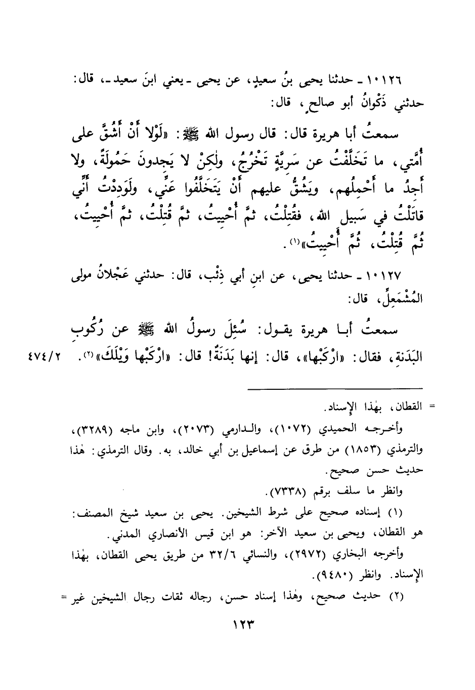 ١٠١٢٦ - حَدَّثَنَا يَحْيَى بْنُ سَعِيدٍ، عَنْ يَحْيَى يَعْنِي ابْنَ سَعِيدٍ، قَالَ: حَدَّثَنِي ذَكْوَانُ أَبُو صَالِحٍ، قَالَ: سَمِعْتُ أَبَا هُرَيْرَةَ، قَالَ: قَالَ رَسُولُ اللهِ صَلَّى اللهُ عَلَيْهِ وَسَلَّمَ: " لَوْلَا أَنْ أَشُقَّ عَلَى أُمَّتِي مَا تَخَلَّفْتُ عَنْ سَرِيَّةٍ تَخْرُجُ، وَلَكِنْ لَا يَجِدُونَ حَمُولَةً، وَلَا أَجِدُ مَا أَحْمِلُهُمْ، وَيَشُقُّ عَلَيْهِمْ أَنْ يَتَخَلَّفُوا عَنِّي، وَلَوَدِدْتُ أَنِّي قَاتَلْتُ فِي سَبِيلِ اللهِ فَقُتِلْتُ، ثُمَّ أُحْيِيتُ، ثُمَّ قُتِلْتُ، ثُمَّ أُحْيِيتُ، ثُمَّ قُتِلْتُ، ثُمَّ أُحْيِيتُ " (١)