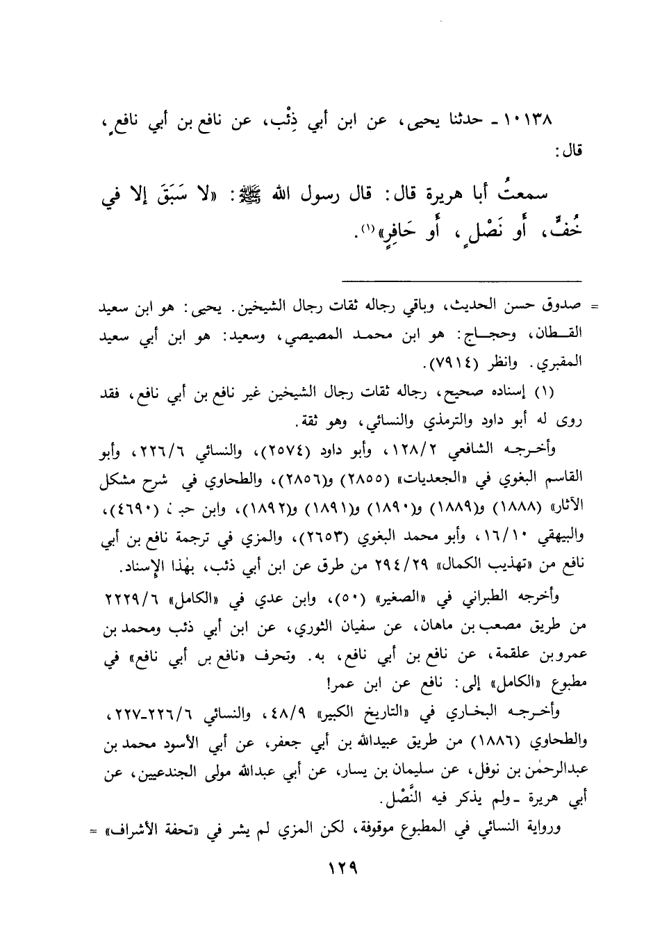 ١٠١٣٨ - حَدَّثَنَا يَحْيَى، عَنِ ابْنِ أَبِي ذِئْبٍ، عَنْ نَافِعِ بْنِ أَبِي نَافِعٍ، قَالَ: سَمِعْتُ أَبَا هُرَيْرَةَ، قَالَ: قَالَ رَسُولُ اللهِ صَلَّى اللهُ عَلَيْهِ وَسَلَّمَ: " لَا سَبَقَ إِلَّا فِي خُفٍّ، أَوْ نَصْلٍ، أَوْ حَافِرٍ "، (١)