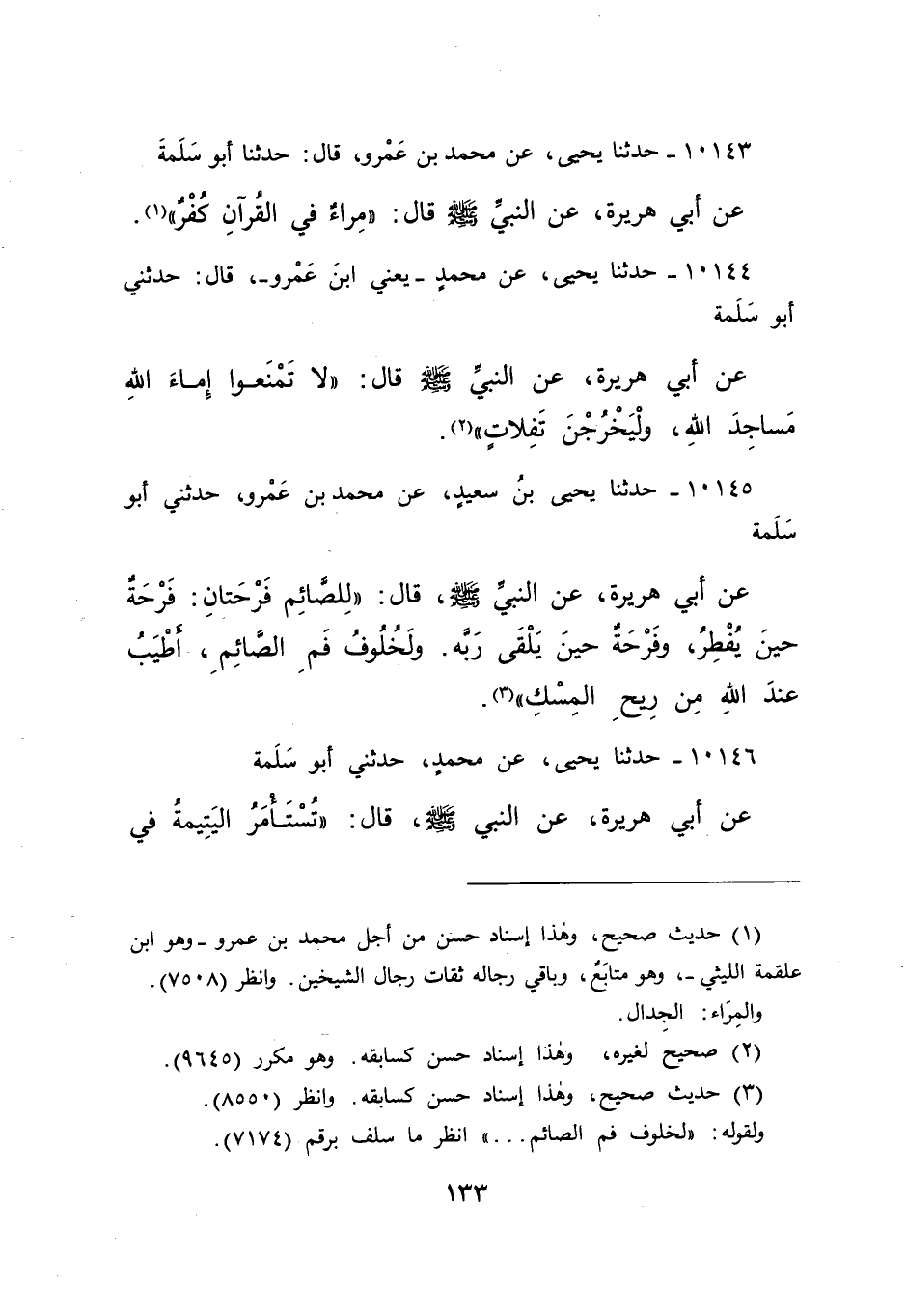 ١٠١٤٣ - حَدَّثَنَا يَحْيَى، عَنْ مُحَمَّدِ بْنِ عَمْرٍو، قَالَ: حَدَّثَنَا أَبُو سَلَمَةَ، عَنِ أَبِي هُرَيْرَةَ، عَنِ النَّبِيِّ صَلَّى اللهُ عَلَيْهِ وَسَلَّمَ قَالَ: " مِرَاءٌ فِي الْقُرْآنِ كُفْرٌ " (١)
