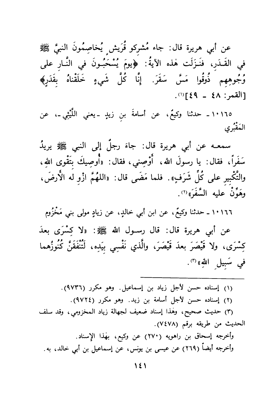 عَنِ أَبِي هُرَيْرَةَ، قَالَ: جَاءَ مُشْرِكُو قُرَيْشٍ يُخَاصِمُونَ النَّبِيَّ صَلَّى اللهُ عَلَيْهِ وَسَلَّمَ فِي الْقَدَرِ، فَنَزَلَتْ هَذِهِ الْآيَةُ: " {يَوْمَ يُسْحَبُونَ فِي النَّارِ عَلَى وُجُوهِهِمْ ذُوقُوا مَسَّ سَقَرَ إِنَّا كُلَّ شَيْءٍ خَلَقْنَاهُ بِقَدَرٍ} [القمر: ٤٨-٤٩] (١) "