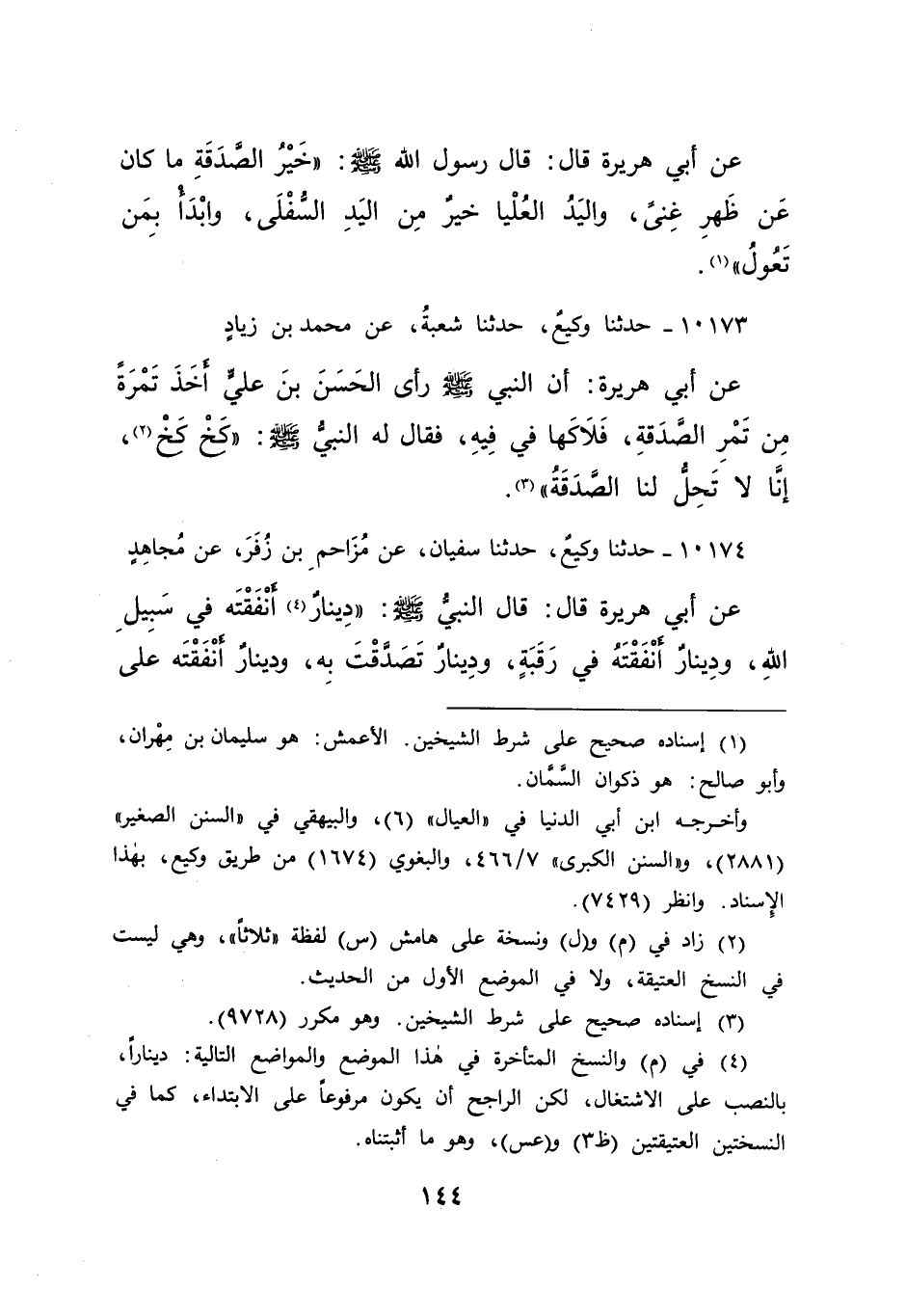١٠١٧٤ - حَدَّثَنَا وَكِيعٌ، حَدَّثَنَا سُفْيَانُ، عَنْ مُزَاحِمِ بْنِ زُفَرَ، عَنْ مُجَاهِدٍ، عَنْ أَبِي هُرَيْرَةَ، قَالَ: قَالَ النَّبِيُّ صَلَّى اللهُ عَلَيْهِ وَسَلَّمَ: " دِينَارٌ (٤) أَنْفَقْتَهُ فِي سَبِيلِ اللهِ، وَدِينَارٌ أَنْفَقْتَهُ فِي رَقَبَةٍ، وَدِينَارٌ تَصَدَّقْتَ بِهِ، وَدِينَارٌ أَنْفَقْتَهُ عَلَى