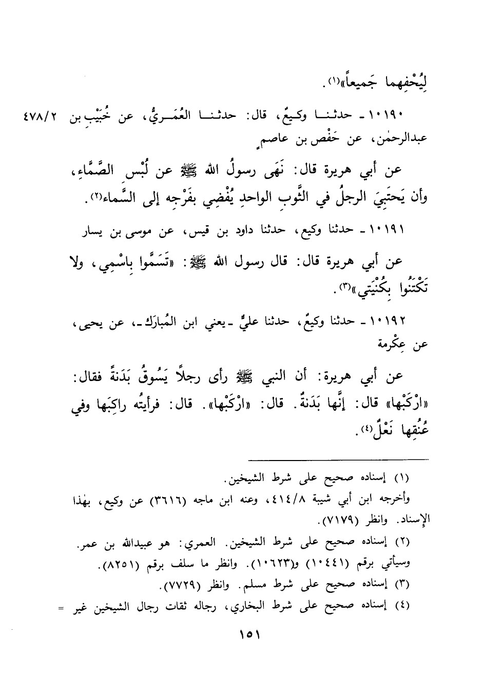 ١٠١٩٠ - حَدَّثَنَا وَكِيعٌ، قَالَ: حَدَّثَنَا الْعُمَرِيُّ، عَنْ خُبَيْبِ بْنِ عَبْدِ الرَّحْمَنِ، عَنْ حَفْصِ بْنِ عَاصِمٍ، عَنِ أَبِي هُرَيْرَةَ، قَالَ: " نَهَى رَسُولُ اللهِ صَلَّى اللهُ عَلَيْهِ وَسَلَّمَ عَنْ لُبْسِ الصَّمَّاءِ، وَأَنْ يَحْتَبِيَ الرَّجُلُ فِي الثَّوْبِ الْوَاحِدِ يُفْضِي بِفَرْجِهِ إِلَى السَّمَاءِ " (٢)