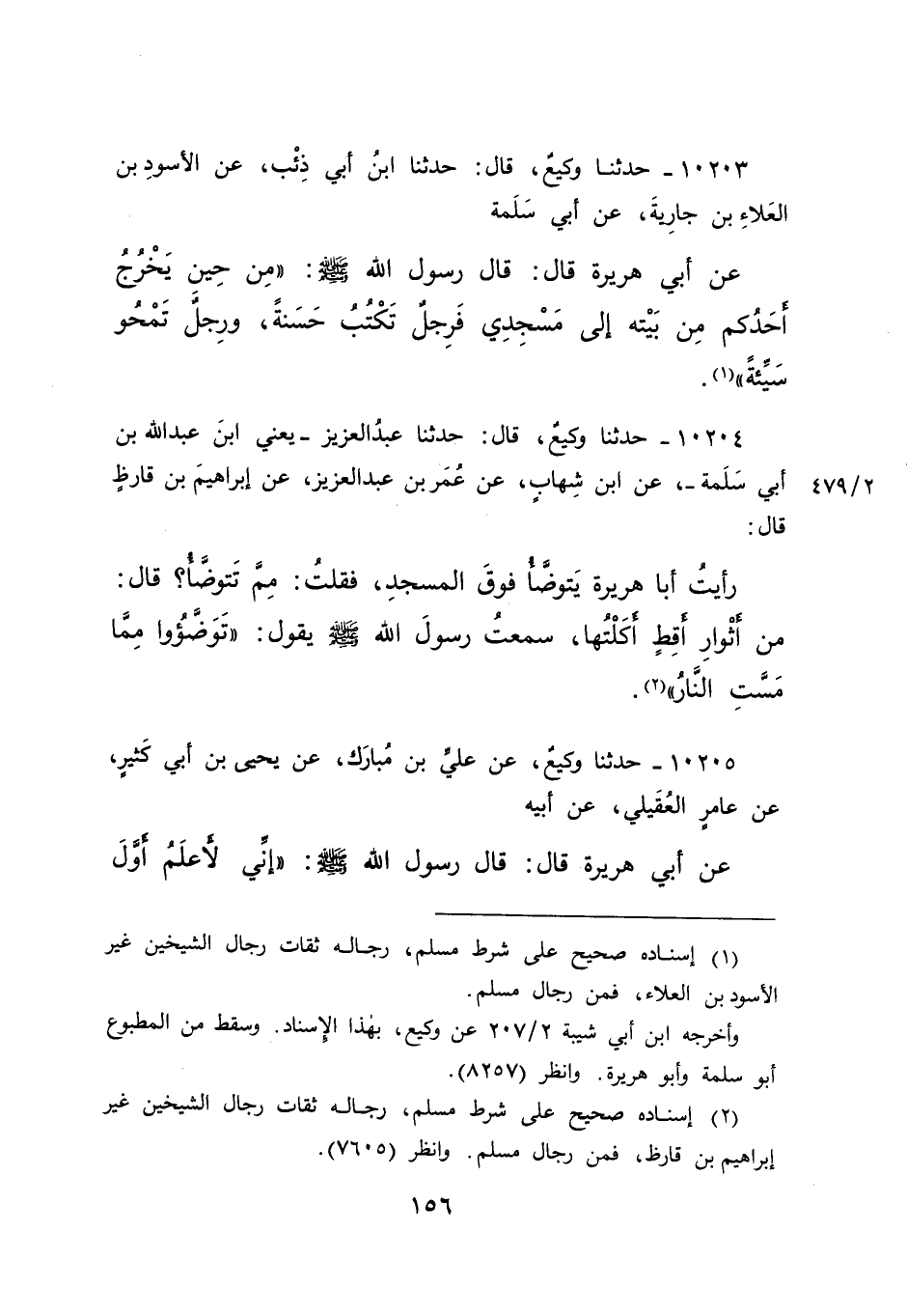 ١٠٢٠٤ - حَدَّثَنَا وَكِيعٌ، قَالَ: حَدَّثَنَا عَبْدُ الْعَزِيزِ يَعْنِي ابْنَ عَبْدِ اللهِ بْنِ أَبِي سَلَمَةَ، عَنِ ابْنِ شِهَابٍ، عَنْ عُمَرَ بْنِ عَبْدِ الْعَزِيزِ، عَنْ إِبْرَاهِيمَ بْنِ قَارِظٍ، قَالَ: رَأَيْتُ أَبَا هُرَيْرَةَ يَتَوَضَّأُ فَوْقَ الْمَسْجِدِ، فَقُلْتُ: مِمَّ تَتَوَضَّأُ؟ قَالَ: مِنْ أَثْوَارِ أَقِطٍ أَكَلْتُهَا، سَمِعْتُ رَسُولَ اللهِ صَلَّى اللهُ عَلَيْهِ وَسَلَّمَ يَقُولُ: " تَوَضَّئُوا مِمَّا مَسَّتِ النَّارُ " (٢)