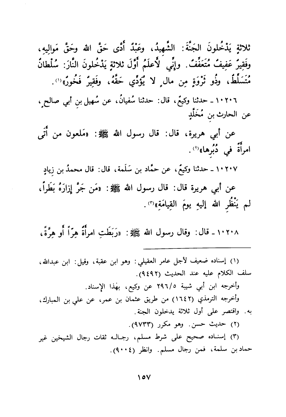 ١٠٢٠٧ - حَدَّثَنَا وَكِيعٌ، عَنْ حَمَّادِ بْنِ سَلَمَةَ، قَالَ: قَالَ مُحَمَّدُ بْنُ زِيَادٍ: عَنِ أَبِي هُرَيْرَةَ، قَالَ: قَالَ رَسُولُ اللهِ صَلَّى اللهُ عَلَيْهِ وَسَلَّمَ: " مَنْ جَرَّ إِزَارَهُ بَطَرًا، لَمْ يَنْظُرِ اللهُ إِلَيْهِ يَوْمَ الْقِيَامَةِ " (٣)