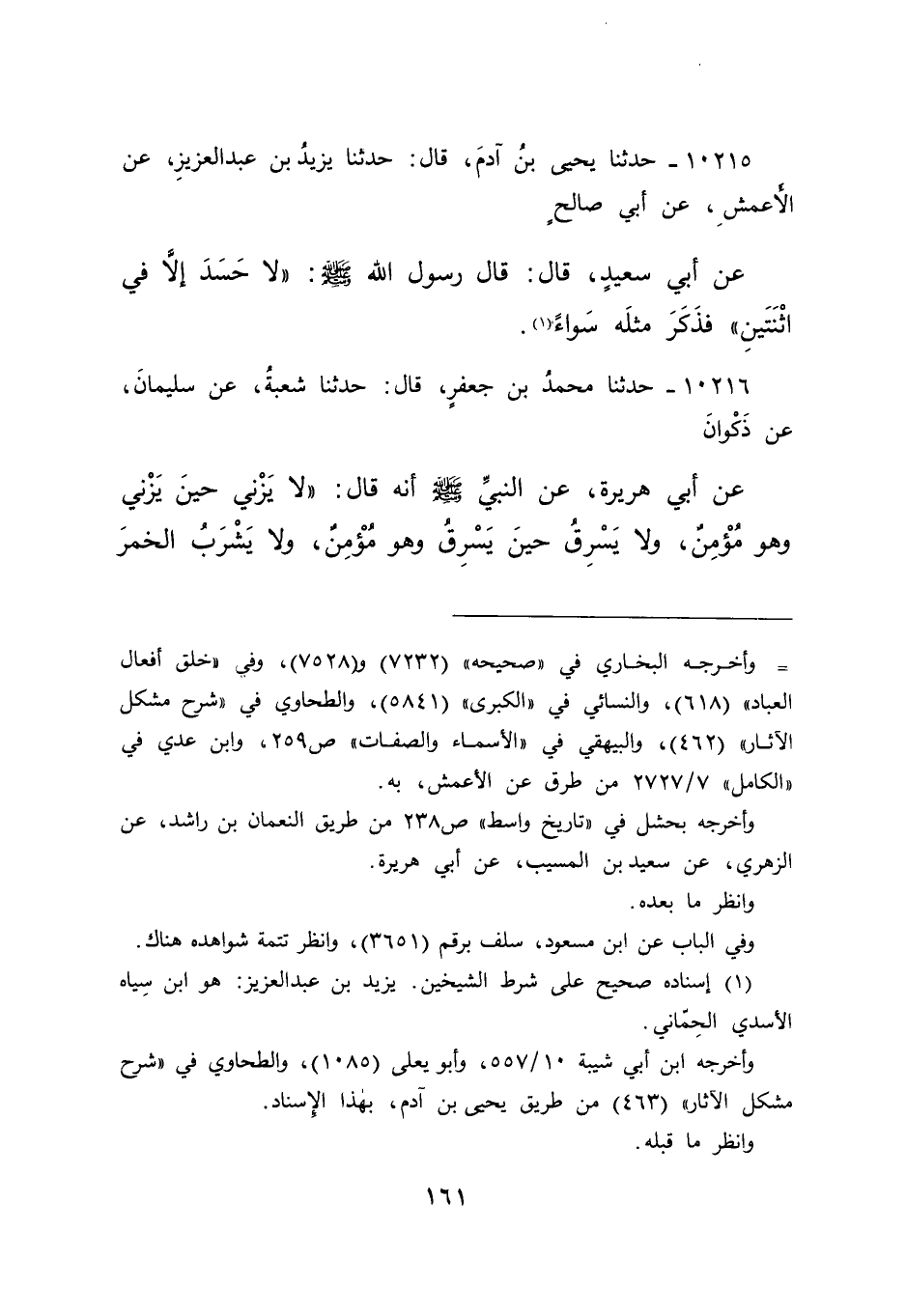 ١٠٢١٥ - حَدَّثَنَا يَحْيَى بْنُ آدَمَ، قَالَ: حَدَّثَنَا يَزِيدُ بْنُ عَبْدِ الْعَزِيزِ، عَنِ الْأَعْمَشِ، عَنِ أَبِي صَالِحٍ، عَنِ أَبِي سَعِيدٍ، قَالَ: قَالَ رَسُولُ اللهِ صَلَّى اللهُ عَلَيْهِ وَسَلَّمَ: " لَا حَسَدَ إِلَّا فِي اثْنَتَيْنِ "، فَذَكَرَ مِثْلَهُ سَوَاءً (١)