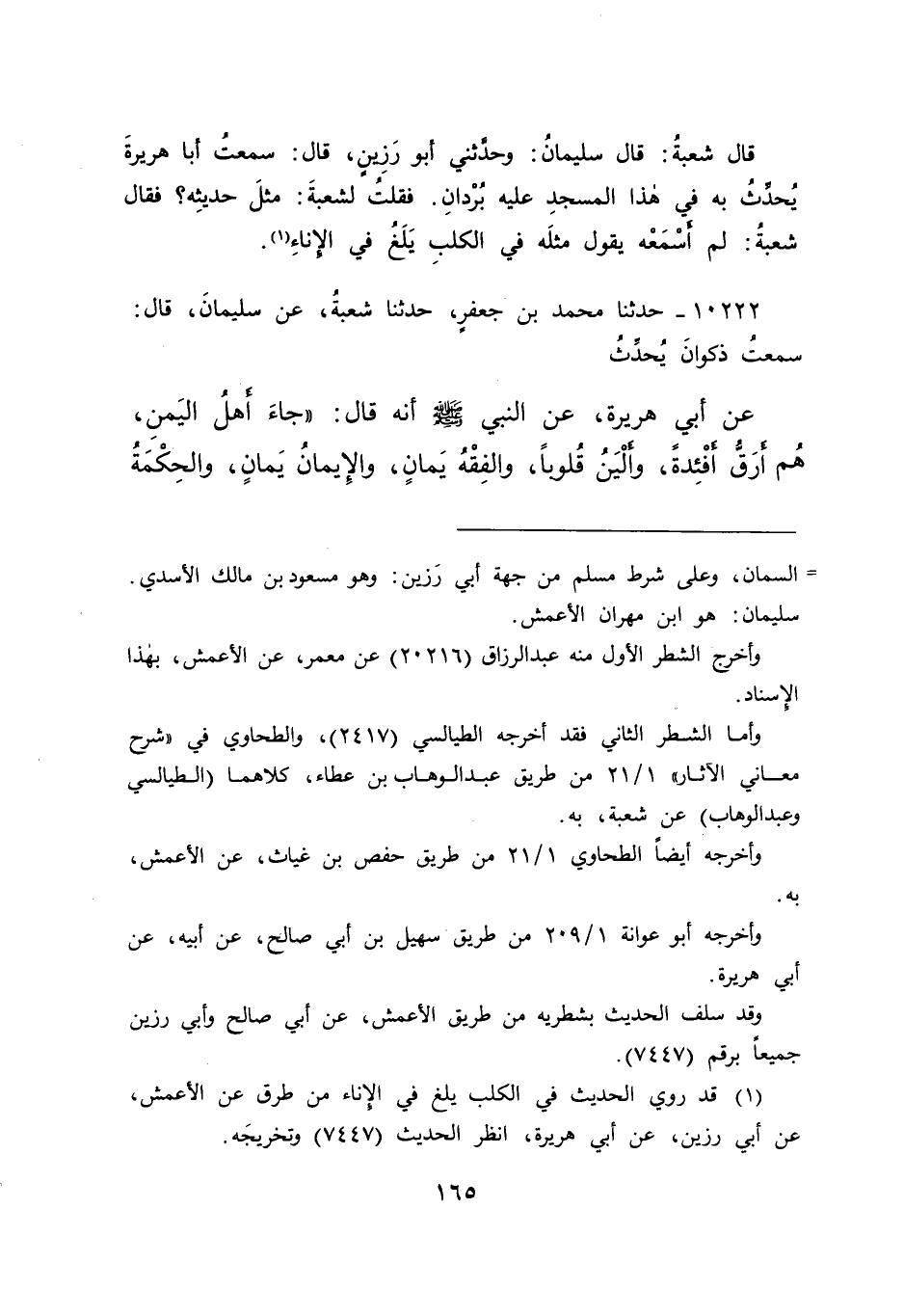 ١٠٢٢٢ - حَدَّثَنَا مُحَمَّدُ بْنُ جَعْفَرٍ، حَدَّثَنَا شُعْبَةُ، عَنْ سُلَيْمَانَ قَالَ: سَمِعْتُ ذَكْوَانَ يُحَدِّثُ، عَنْ أَبِي هُرَيْرَةَ، عَنِ النَّبِيِّ صَلَّى اللهُ عَلَيْهِ وَسَلَّمَ: " أَنَّهُ قَالَ: " جَاءَ أَهْلُ الْيَمَنِ، هُمْ أَرَقُّ أَفْئِدَةً، وَأَلْيَنُ قُلُوبًا، وَالْفِقْهُ يَمَانٍ، وَالْإِيمَانُ يَمَانٍ، وَالْحِكْمَةُ