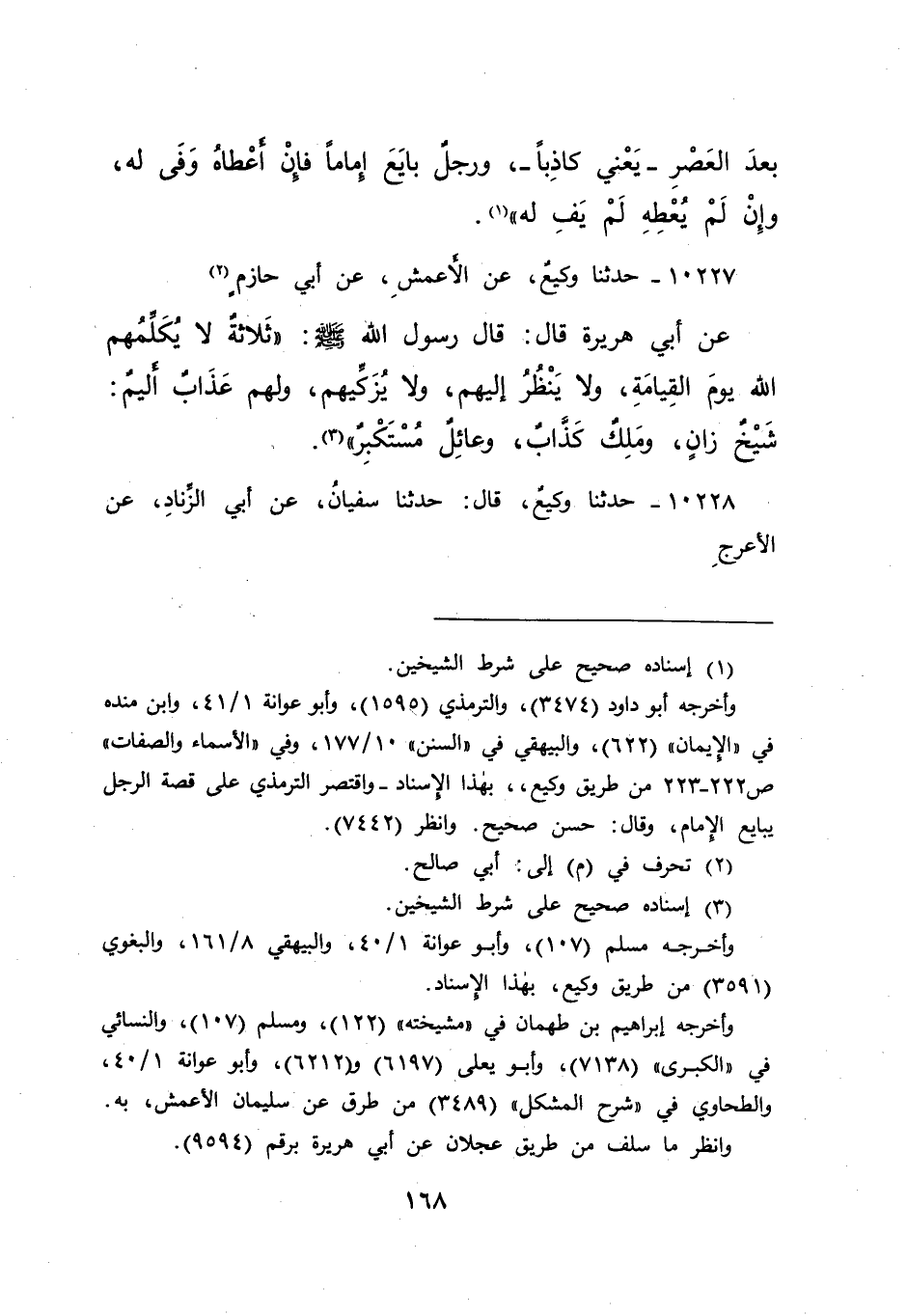 ١٠٢٢٧ - حَدَّثَنَا وَكِيعٌ، عَنِ الْأَعْمَشِ، عَنِ أَبِي حَازِمٍ (٢) ، عَنِ أَبِي هُرَيْرَةَ، قَالَ: قَالَ رَسُولُ اللهِ صَلَّى اللهُ عَلَيْهِ وَسَلَّمَ: " ثَلَاثَةٌ لَا يُكَلِّمُهُمُ اللهُ يَوْمَ الْقِيَامَةِ، وَلَا يَنْظُرُ إِلَيْهِمْ، وَلَا يُزَكِّيهِمْ، وَلَهُمْ عَذَابٌ أَلِيمٌ: شَيْخٌ زَانٍ، وَمَلِكٌ كَذَّابٌ، وَعَائِلٌ مُسْتَكْبِرٌ " (٣)