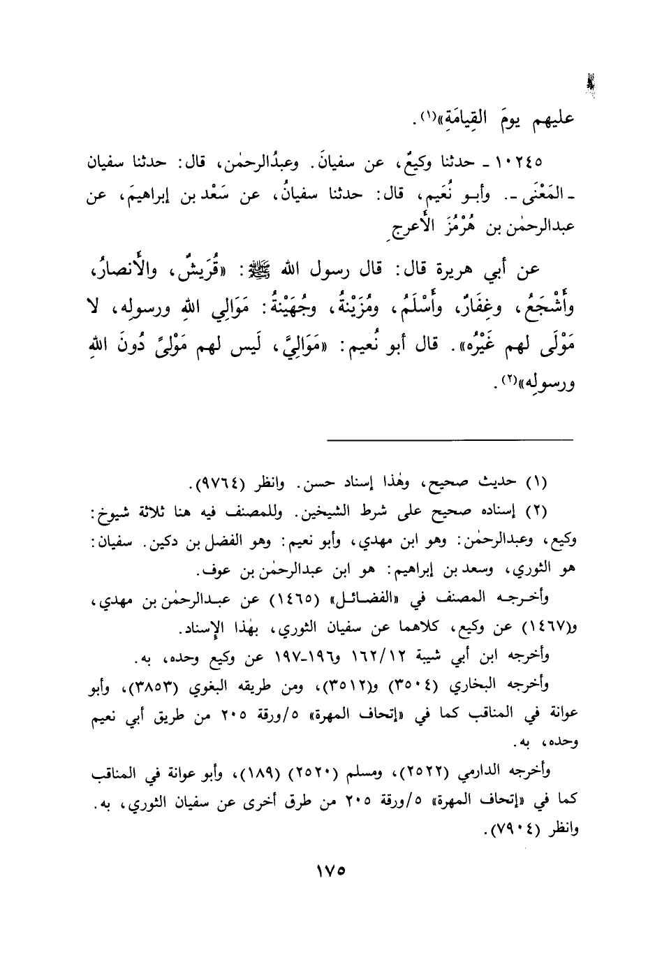 ١٠٢٤٥ - حَدَّثَنَا وَكِيعٌ، عَنْ سُفْيَانَ، وَعَبْدُ الرَّحْمَنِ، قَالَ: حَدَّثَنَا سُفْيَانُ، الْمَعْنَى، وَأَبُو نُعَيْمٍ، قَالَ: حَدَّثَنَا سُفْيَانُ، عَنْ سَعْدِ بْنِ إِبْرَاهِيمَ، عَنْ عَبْدِ الرَّحْمَنِ بْنِ هُرْمُزَ الْأَعْرَجِ، عَنْ أَبِي هُرَيْرَةَ، قَالَ: قَالَ رَسُولُ اللهِ صَلَّى اللهُ عَلَيْهِ وَسَلَّمَ: " قُرَيْشٌ، وَالْأَنْصَارُ، وَأَشْجَعُ، وَغِفَارٌ، وَأَسْلَمُ، وَمُزَيْنَةُ، وَجُهَيْنَةُ مَوَالِي اللهِ وَرَسُولِهِ، لَا مَوْلَى لَهُمْ غَيْرَهُ "، قَالَ أَبُو نُعَيْمٍ: مَوَالِيَّ لَيْسَ لَهُمْ مَوْلًى دُونَ اللهِ وَرَسُولِهِ (٢)