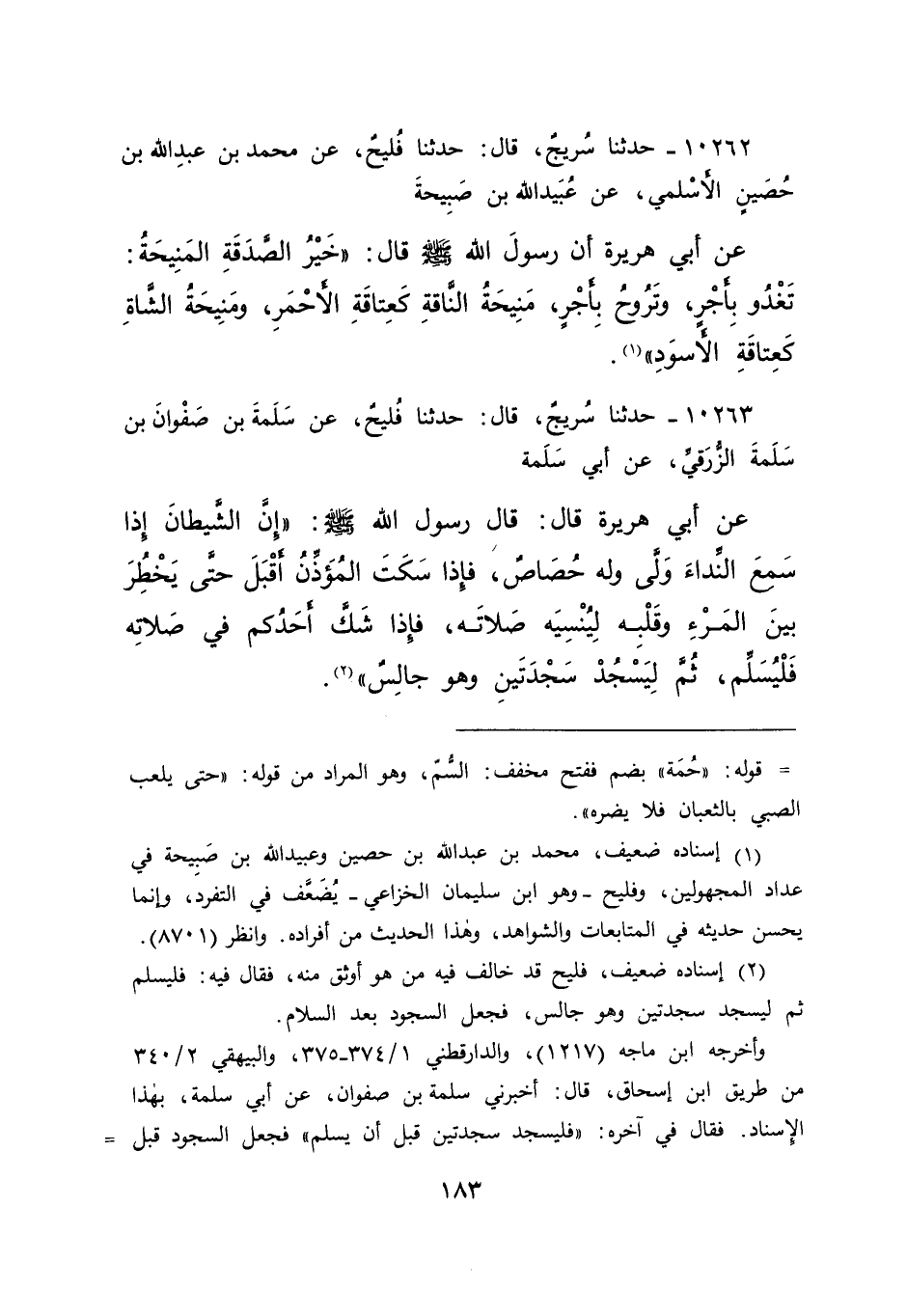 ١٠٢٦٢ - حَدَّثَنَا سُرَيْجٌ، قَالَ: حَدَّثَنَا فُلَيْحٌ، عَنْ مُحَمَّدِ بْنِ عَبْدِ اللهِ بْنِ حُصَيْنٍ الْأَسْلَمِيِّ، عَنْ عُبَيْدِ اللهِ بْنِ صَبِيحَةَ، عَنْ أَبِي هُرَيْرَةَ، أَنَّ رَسُولَ اللهِ صَلَّى اللهُ عَلَيْهِ وَسَلَّمَ قَالَ: " خَيْرُ الصَّدَقَةِ الْمَنِيحَةُ، تَغْدُو بِأَجْرٍ، وَتَرُوحُ بِأَجْرٍ، مَنِيحَةُ النَّاقَةِ كَعِتَاقَةِ الْأَحْمَرِ، وَمَنِيحَةُ الشَّاةِ كَعِتَاقَةِ الْأَسْوَدِ " (١)