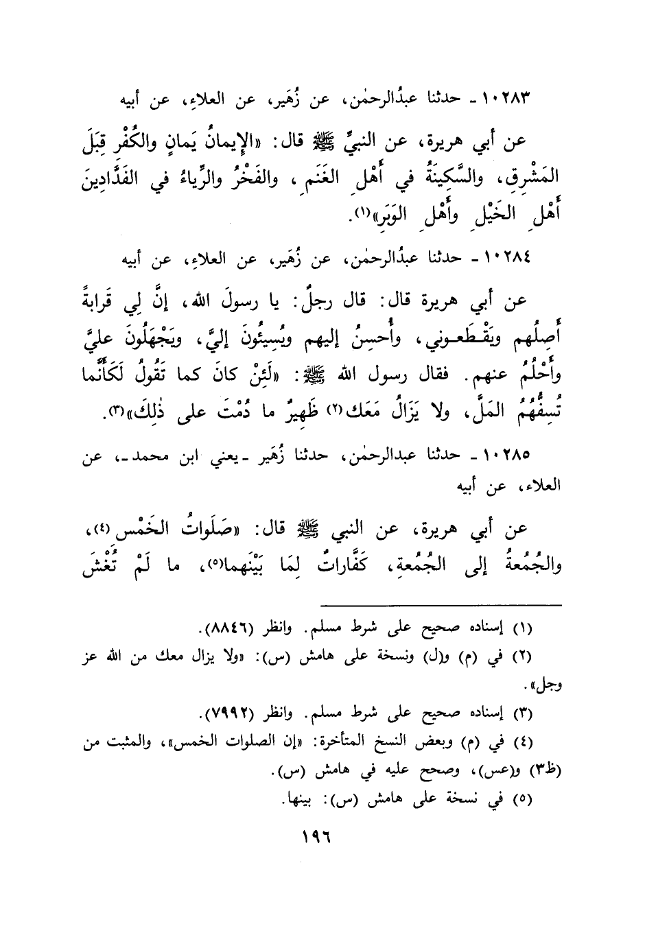 ١٠٢٨٤ - حَدَّثَنَا عَبْدُ الرَّحْمَنِ، عَنْ زُهَيْرٍ، عَنِ الْعَلَاءِ، عَنْ أَبِيهِ، عَنْ أَبِي هُرَيْرَةَ، قَالَ: قَالَ رَجُلٌ: يَا رَسُولَ اللهِ، إِنَّ لِي قَرَابَةً أَصِلُهُمْ وَيَقْطَعُونِي، وَأُحْسِنُ إِلَيْهِمْ وَيُسِيئُونَ إِلَيَّ، وَيَجْهَلُونَ عَلَيَّ، وَأَحْلُمُ عَنْهُمْ، فَقَالَ رَسُولُ اللهِ صَلَّى اللهُ عَلَيْهِ وَسَلَّمَ: " لَئِنْ كَانَ كَمَا تَقُولُ لَكَأَنَّمَا تُسِفُّهُمْ الْمَلَّ، وَلَا يَزَالُ مَعَكَ (٢) ظَهِيرٌ مَادُمْتَ عَلَى ذَلِكَ " (٣)