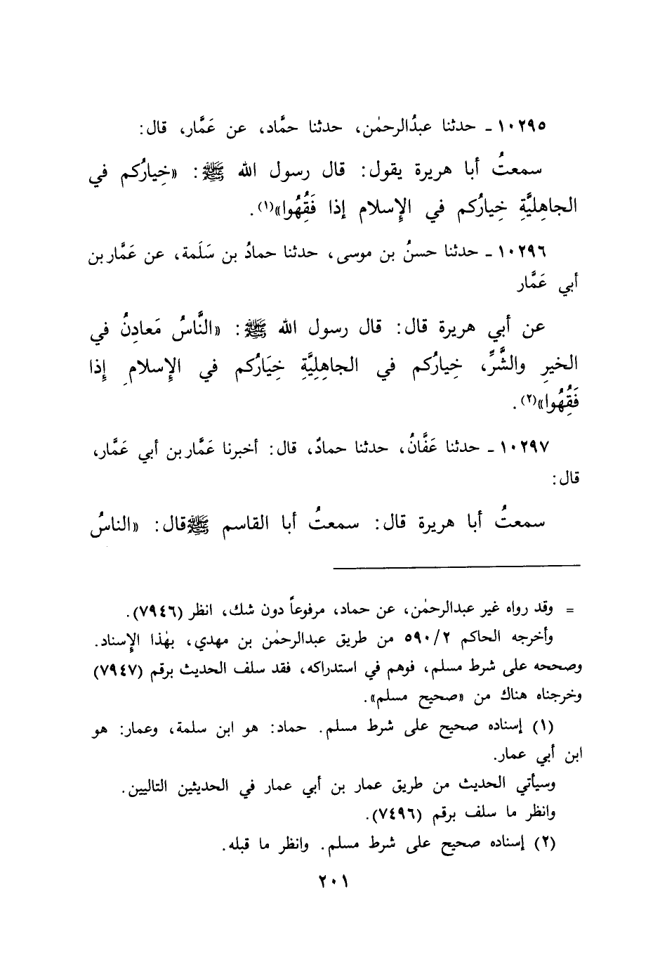 ١٠٢٩٥ - حَدَّثَنَا عَبْدُ الرَّحْمَنِ، حَدَّثَنَا حَمَّادٌ، عَنْ عَمَّارٍ، قَالَ: سَمِعْتُ أَبَا هُرَيْرَةَ، يَقُولُ: قَالَ رَسُولُ اللهِ صَلَّى اللهُ عَلَيْهِ وَسَلَّمَ: " خِيَارُكُمْ فِي الْجَاهِلِيَّةِ خِيَارُكُمْ فِي الْإِسْلَامِ، إِذَا فَقِهُوا " (١)
