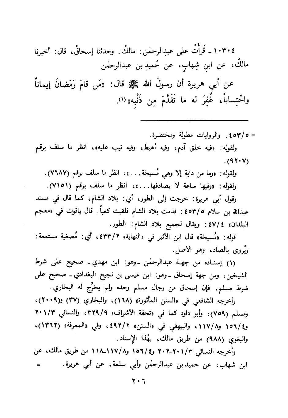 ١٠٣٠٤ - قَرَأْتُ عَلَى عَبْدِ الرَّحْمَنِ: مَالِكٌ، وَحَدَّثَنَا إِسْحَاقُ، قَالَ: أَخْبَرَنَا مَالِكٌ، عَنِ ابْنِ شِهَابٍ، عَنْ حُمَيْدِ بْنِ عَبْدِ الرَّحْمَنِ، عَنْ أَبِي هُرَيْرَةَ، أَنَّ رَسُولَ اللهِ صَلَّى اللهُ عَلَيْهِ وَسَلَّمَ قَالَ: " مَنْ قَامَ رَمَضَانَ إِيمَانًا وَاحْتِسَابًا، غُفِرَ لَهُ مَا تَقَدَّمَ مِنْ ذَنْبِهِ " (١)