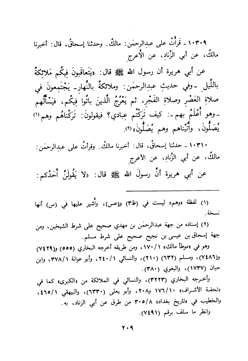 ١٠٣٠٩ - قَرَأْتُ عَلَى عَبْدِ الرَّحْمَنِ: مَالِكٌ، وَحَدَّثَنَا إِسْحَاقُ، قَالَ: أَخْبَرَنَا مَالِكٌ، عَنْ أَبِي الزِّنَادِ، عَنِ الْأَعْرَجِ، عَنْ أَبِي هُرَيْرَةَ، أَنَّ رَسُولَ اللهِ صَلَّى اللهُ عَلَيْهِ وَسَلَّمَ قَالَ: " يَتَعَاقَبُونَ فِيكُمْ مَلَائِكَةٌ بِاللَّيْلِ - وَفِي حَدِيثِ عَبْدِ الرَّحْمَنِ: وَمَلَائِكَةٌ بِالنَّهَارِ - يَجْتَمِعُونَ فِي صَلَاةِ الْعَصْرِ، وَصَلَاةِ الْفَجْرِ، ثُمَّ يَعْرُجُ الَّذِينَ بَاتُوا فِيكُمْ، فَيَسْأَلُهُمْ وَهُوَ أَعْلَمُ بِهِمْ، كَيْفَ تَرَكْتُمْ عِبَادِي؟ فَيَقُولُونَ: تَرَكْنَاهُمْ وَهُمْ (١) يُصَلُّونَ، وَأَتَيْنَاهُمْ وَهُمْ يُصَلُّونَ " (٢)