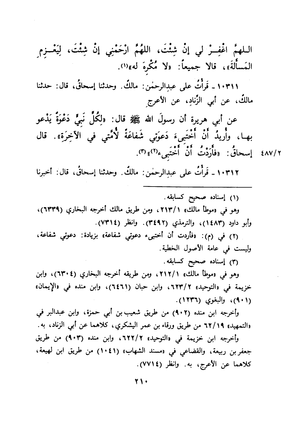 ١٠٣١١ - قَرَأْتُ عَلَى عَبْدِ الرَّحْمَنِ: مَالِكٌ، وَحَدَّثَنَا إِسْحَاقُ، قَالَ: حَدَّثَنَا مَالِكٌ، عَنْ أَبِي الزِّنَادِ، عَنِ الْأَعْرَجِ، عَنْ أَبِي هُرَيْرَةَ، أَنَّ رَسُولَ اللهِ صَلَّى اللهُ عَلَيْهِ وَسَلَّمَ قَالَ: " لِكُلِّ نَبِيٍّ دَعْوَةٌ يَدْعُو بِهَا، وَأُرِيدُ أَنْ أَخْتَبِئَ دَعْوَتِي شَفَاعَةً لِأُمَّتِي فِي الْآخِرَةِ "، قَالَ إِسْحَاقُ: فَأَرَدْتُ أَنْ أَخْتَبِئَ (٢) (٣)