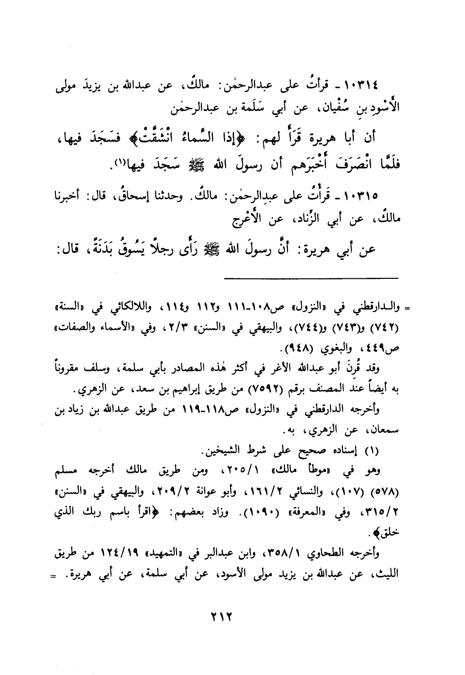١٠٣١٤ - قَرَأْتُ عَلَى عَبْدِ الرَّحْمَنِ: مَالِكٌ، عَنْ عَبْدِ اللهِ بْنِ يَزِيدَ مَوْلَى الْأَسْوَدِ بْنِ سُفْيَانَ، عَنْ أَبِي سَلَمَةَ بْنِ عَبْدِ الرَّحْمَنِ، أَنَّ أَبَا هُرَيْرَةَ " قَرَأَ لَهُمْ إِذَا السَّمَاءُ انْشَقَّتْ، فَسَجَدَ فِيهَا، فَلَمَّا انْصَرَفَ أَخْبَرَهُمْ أَنَّ رَسُولَ اللهِ صَلَّى اللهُ عَلَيْهِ وَسَلَّمَ سَجَدَ فِيهَا " (١)