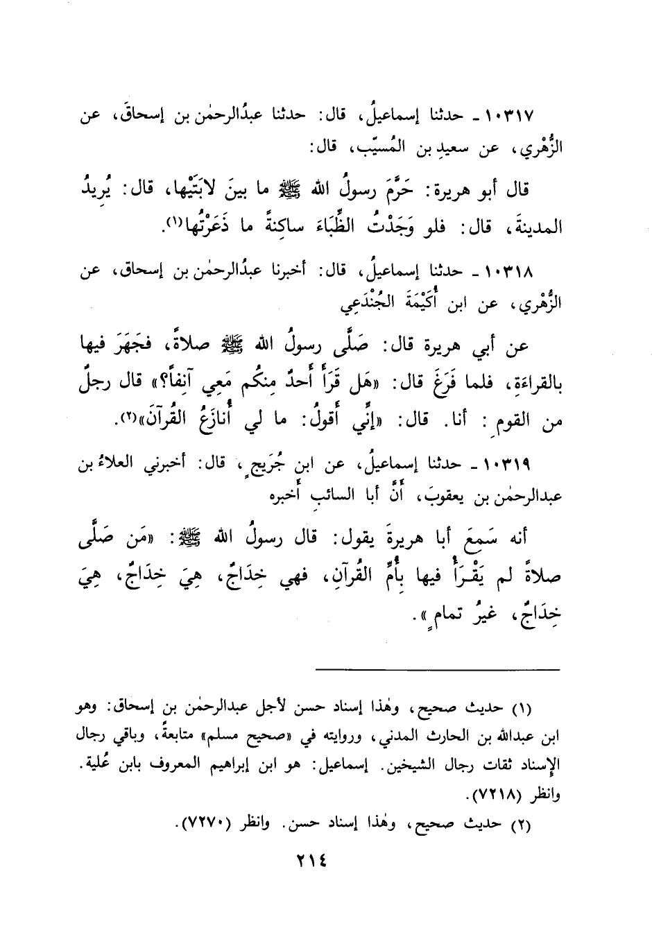١٠٣١٧ - حَدَّثَنَا إِسْمَاعِيلُ، قَالَ: حَدَّثَنَا عَبْدُ الرَّحْمَنِ بْنُ إِسْحَاقَ، عَنِ الزُّهْرِيِّ، عَنْ سَعِيدِ بْنِ الْمُسَيِّبِ، قَالَ: قَالَ أَبُو هُرَيْرَةَ: " حَرَّمَ رَسُولُ اللهِ صَلَّى اللهُ عَلَيْهِ وَسَلَّمَ مَا بَيْنَ لَابَتَيْهَا، قَالَ: يُرِيدُ الْمَدِينَةَ، قَالَ: فَلَوْ وَجَدْتُ الظِّبَاءَ سَاكِنَةً مَا ذَعَرْتُهَا " (١)