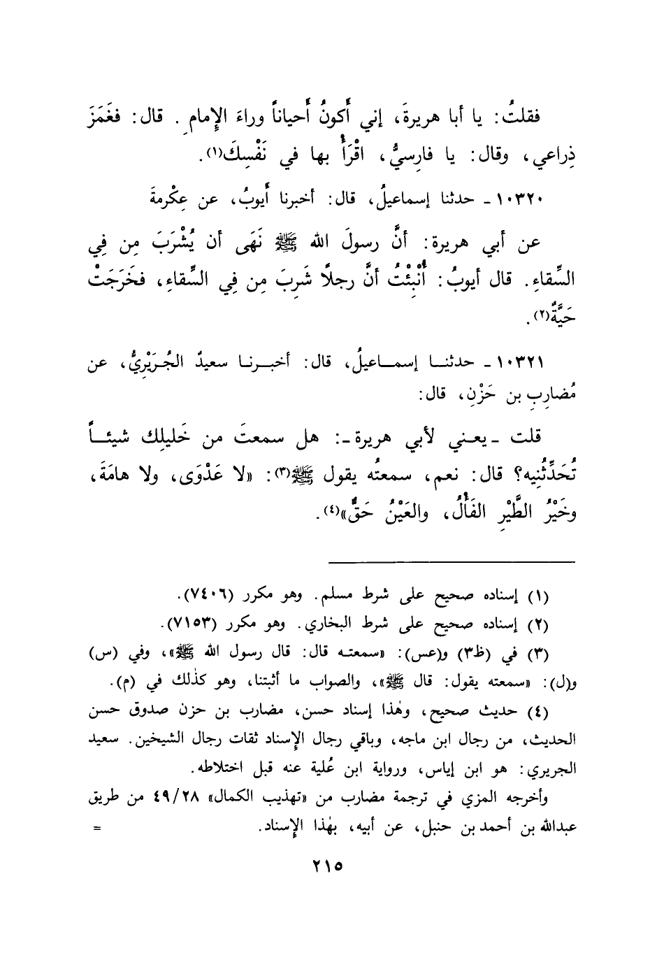 ١٠٣٢١ - حَدَّثَنَا إِسْمَاعِيلُ، قَالَ: أَخْبَرَنَا سَعِيدٌ الْجُرَيْرِيُّ، عَنْ مُضَارِبِ بْنِ حَزْنٍ، قَالَ: قُلْتُ: يَعْنِي لِأَبِي هُرَيْرَةَ: هَلْ سَمِعْتَ مِنْ خَلِيلِكَ شَيْئًا تُحَدِّثُنِيهِ؟ قَالَ: نَعَمْ، سَمِعْتُهُ يَقُولُ صَلَّى اللهُ عَلَيْهِ وَسَلَّمَ (٣) : " لَا عَدْوَى، وَلَا هَامَةَ، وَخَيْرُ الطِّيَرِ الْفَأْلُ، وَالْعَيْنُ حَقٌّ " (٤)