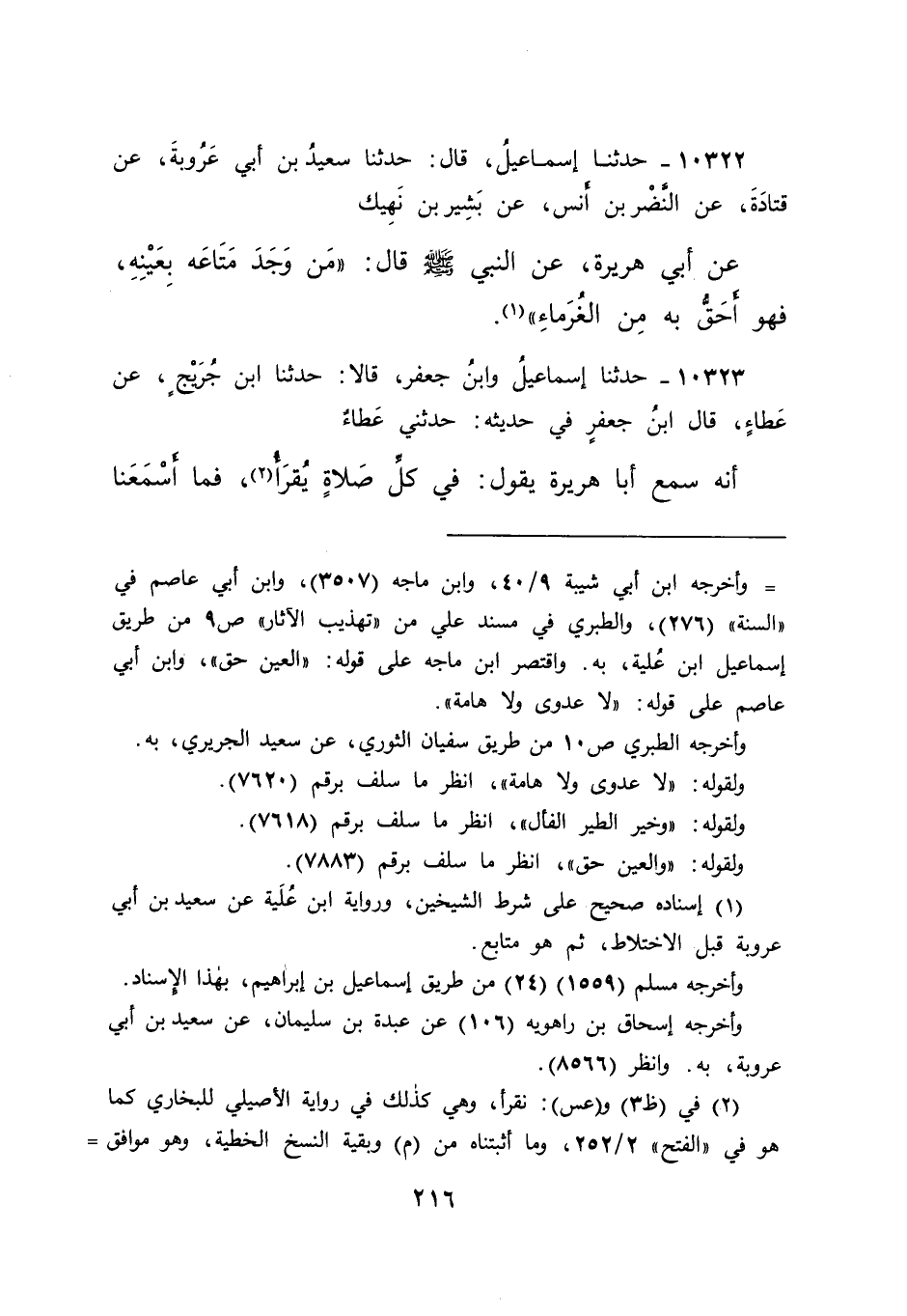 ١٠٣٢٢ - حَدَّثَنَا إِسْمَاعِيلُ، قَالَ: حَدَّثَنَا سَعِيدُ بْنُ أَبِي عَرُوبَةَ، عَنْ قَتَادَةَ، عَنِ النَّضْرِ بْنِ أَنَسٍ، عَنْ بَشِيرِ بْنِ نَهِيكٍ، عَنْ أَبِي هُرَيْرَةَ، عَنِ النَّبِيِّ صَلَّى اللهُ عَلَيْهِ وَسَلَّمَ قَالَ: " مَنْ وَجَدَ مَتَاعَهُ بِعَيْنِهِ، فَهُوَ أَحَقُّ بِهِ مِنَ الْغُرَمَاءِ " (١)