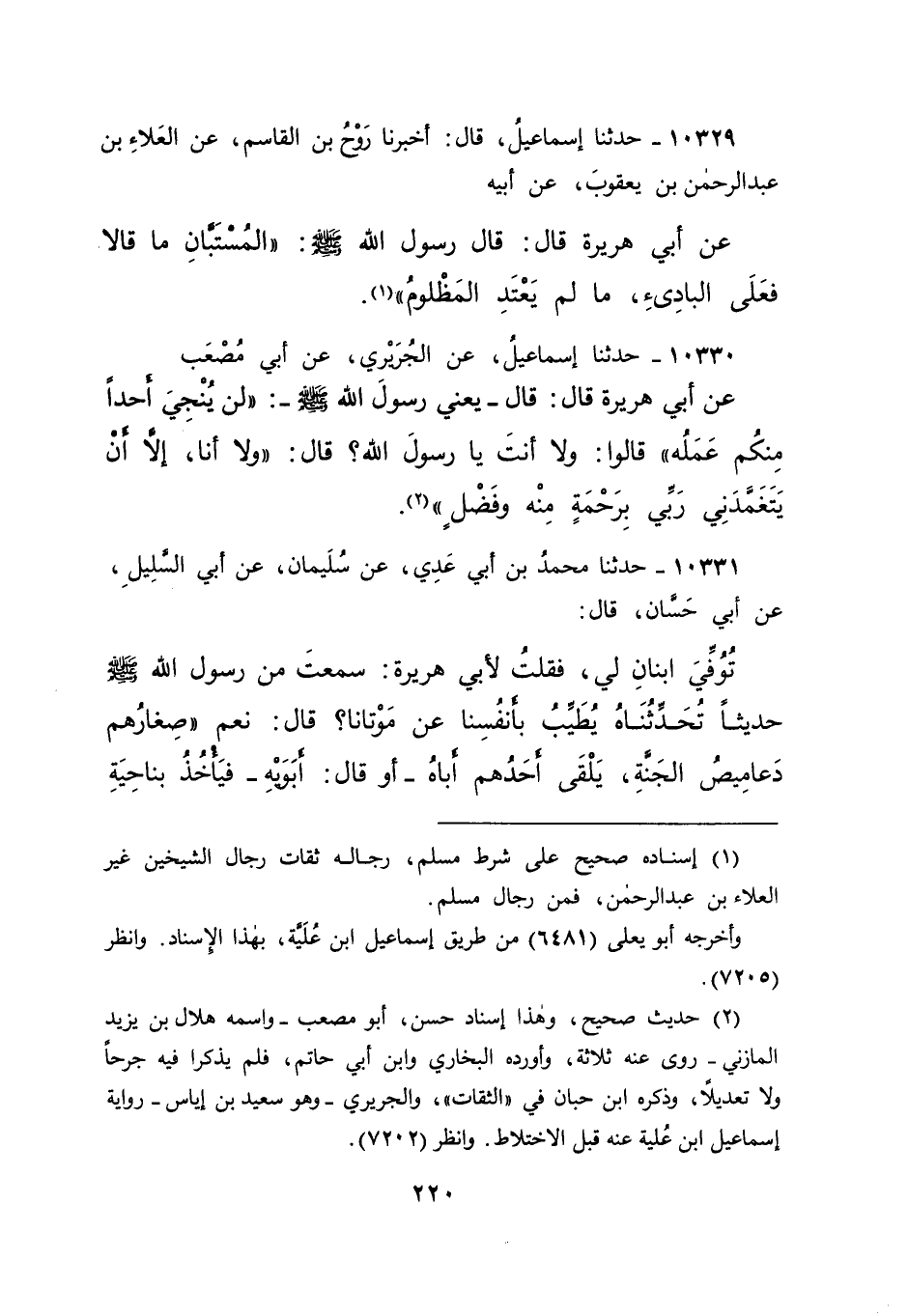 ١٠٣٣١ - حَدَّثَنَا مُحَمَّدُ بْنُ أَبِي عَدِيٍّ، عَنْ سُلَيْمَانَ، عَنْ أَبِي السَّلِيلِ، عَنْ أَبِي حَسَّانَ، قَالَ: تُوُفِّيَ ابْنَانِ لِي، فَقُلْتُ لِأَبِي هُرَيْرَةَ: سَمِعْتَ مِنْ رَسُولِ اللهِ صَلَّى اللهُ عَلَيْهِ وَسَلَّمَ حَدِيثًا تُحَدِّثُنَاهُ يُطَيِّبُ بِأَنْفُسِنَا عَنْ مَوْتَانَا؟ قَالَ: نَعَمْ، صِغَارُهُمْ دَعَامِيصُ الْجَنَّةِ، يَلْقَى أَحَدُهُمْ أَبَاهُ - أَوْ قَالَ: أَبَوَيْهِ - فَيَأْخُذُ بِنَاحِيَةِ