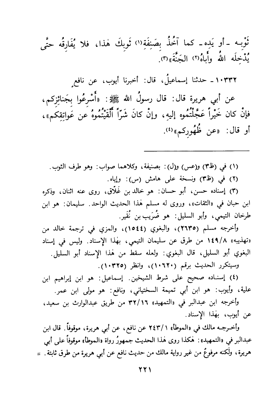 ١٠٣٣٢ - حَدَّثَنَا إِسْمَاعِيلُ، قَالَ: أَخْبَرَنَا أَيُّوبُ، عَنْ نَافِعٍ، عَنْ أَبِي هُرَيْرَةَ، قَالَ: قَالَ رَسُولُ اللهِ صَلَّى اللهُ عَلَيْهِ وَسَلَّمَ: " أَسْرِعُوا بِجَنَائِزِكُمْ، فَإِنْ كَانَ خَيْرًا عَجَّلْتُمُوهُ إِلَيْهِ، وَإِنْ كَانَ شَرًّا، أَلْقَيْتُمُوهُ عَنْ عَوَاتِقِكُمْ "، أَوْ قَالَ: " عَنْ ظُهُورِكُمْ " (٤)