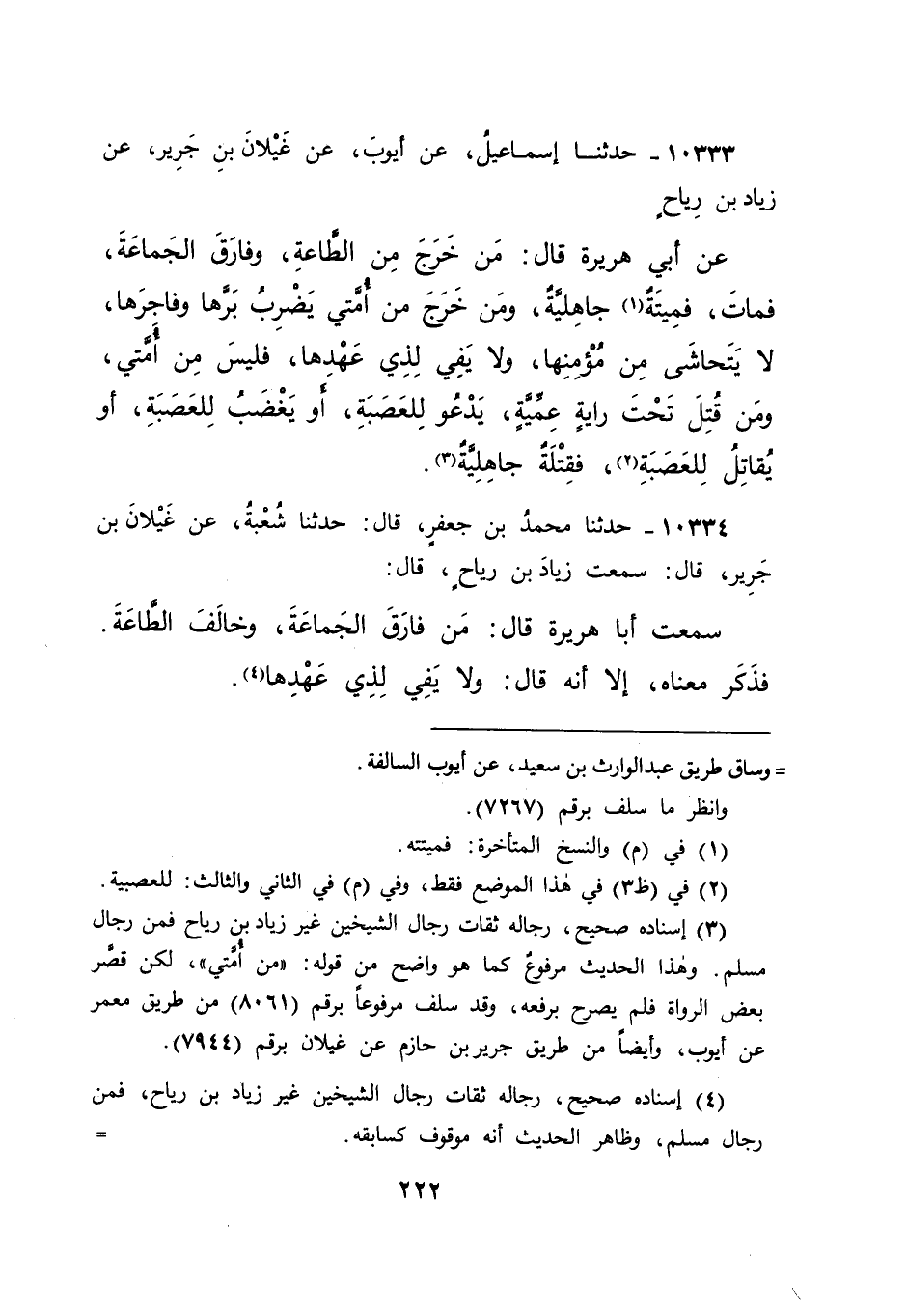 ١٠٣٣٤ - حَدَّثَنَا مُحَمَّدُ بْنُ جَعْفَرٍ قَالَ: حَدَّثَنَا شُعْبَةُ، عَنْ غَيْلَانَ بْنِ جَرِيرٍ، قَالَ: سَمِعْتُ زِيَادَ بْنَ رِيَاحٍ، قَالَ: سَمِعْتُ أَبَا هُرَيْرَةَ، قَالَ: مَنْ فَارَقَ الْجَمَاعَةَ، وَخَالَفَ الطَّاعَةَ، فَذَكَرَ مَعْنَاهُ، إِلَّا أَنَّهُ قَال: " وَلَا يَفِي لِذِي عَهْدِهَا " (٤)