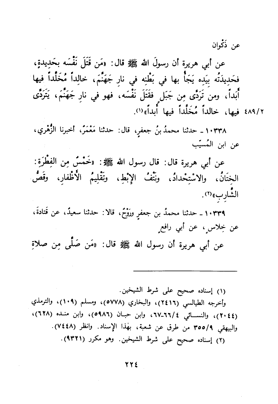 عَنْ ذَكْوَانَ، عَنْ أَبِي هُرَيْرَةَ، أَنَّ رَسُولَ اللهِ صَلَّى اللهُ عَلَيْهِ وَسَلَّمَ قَالَ: " مَنْ قَتَلَ نَفْسَهُ بِحَدِيدَةٍ، فَحَدِيدَتُهُ بِيَدِهِ يَجَأُ بِهَا فِي بَطْنِهِ فِي نَارِ جَهَنَّمَ، خَالِدًا مُخَلَّدًا فِيهَا أَبَدًا، وَمَنْ تَرَدَّى مِنْ جَبَلٍ فَقَتَلَ نَفْسَهُ، فَهُوَ فِي نَارِ جَهَنَّمَ، يَتَرَدَّى فِيهَا خَالِدًا مُخَلَّدًا فِيهَا أَبَدًا " (١)