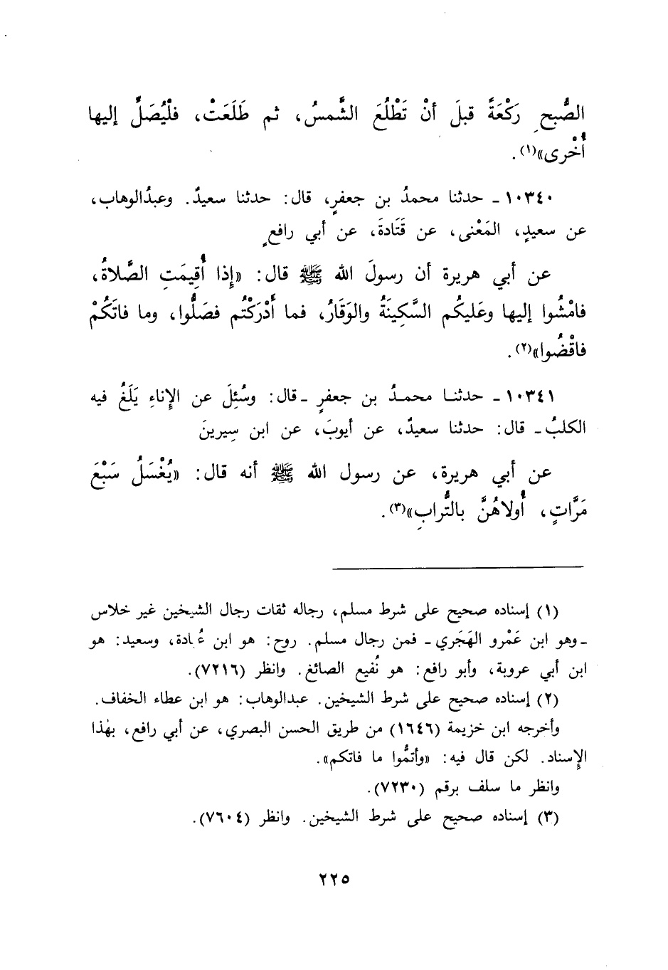 ١٠٣٤٠ - حَدَّثَنَا مُحَمَّدُ بْنُ جَعْفَرٍ، قَالَ: حَدَّثَنَا سَعِيدٌ، وَعَبْدُ الْوَهَّابِ، عَنْ سَعِيدٍ، الْمَعْنَى، عَنْ قَتَادَةَ، عَنْ أَبِي رَافِعٍ، عَنْ أَبِي هُرَيْرَةَ، أَنَّ رَسُولَ اللهِ صَلَّى اللهُ عَلَيْهِ وَسَلَّمَ قَالَ: " إِذَا أُقِيمَتِ الصَّلَاةُ، فَامْشُوا إِلَيْهَا، وَعَلَيْكُمُ السَّكِينَةُ وَالْوَقَارُ، فَمَا أَدْرَكْتُمْ فَصَلُّوا، وَمَا فَاتَكُمْ فَاقْضُوا " (٢)