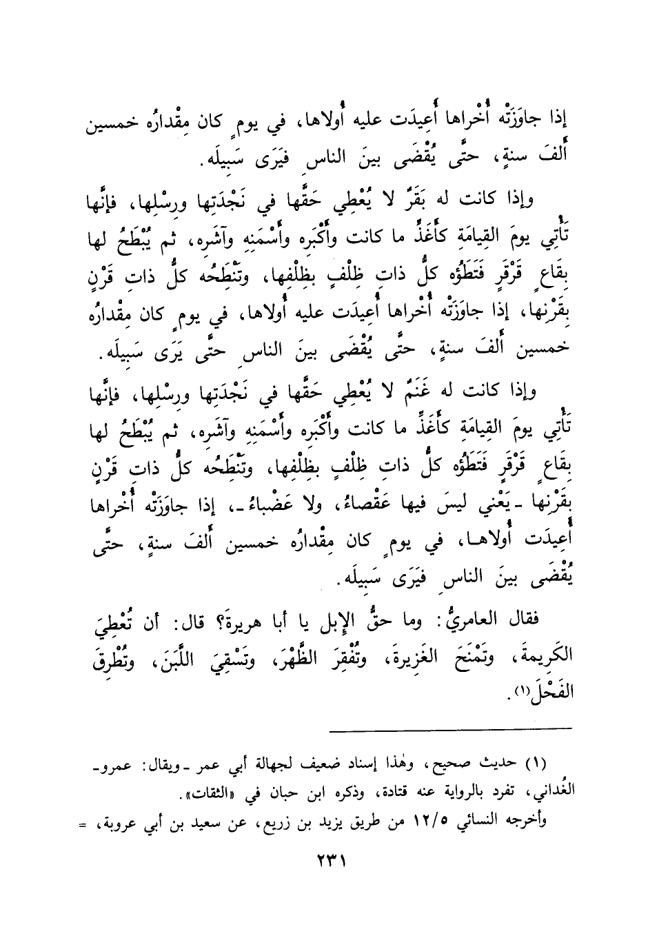 إِذَا جَاوَزَتْهُ أُخْرَاهَا أُعِيدَتْ عَلَيْهِ أُولَاهَا، فِي يَوْمٍ كَانَ مِقْدَارُهُ خَمْسِينَ أَلْفَ سَنَةٍ، حَتَّى يُقْضَى بَيْنَ النَّاسِ فَيَرَى سَبِيلَهُ، وَإِذَا كَانَتْ لَهُ بَقَرٌ لَا يُعْطِي حَقَّهَا فِي نَجْدَتِهَا، وَرِسْلِهَا، فَإِنَّهَا تَأْتِي يَوْمَ الْقِيَامَةِ كَأَغَذِّ مَا كَانَتْ، وَأَكْبَرِهِ، وَأَسْمَنِهِ، وآشَرِهِ، ثُمَّ يُبْطَحُ لَهَا بِقَاعٍ قَرْقَرٍ، فَتَطَؤُهُ كُلُّ ذَاتِ ظِلْفٍ بِظِلْفِهَا، وَتَنْطَحُهُ كُلُّ ذَاتِ قَرْنٍ بِقَرْنِهَا، إِذَا جَاوَزَتْهُ أُخْرَاهَا أُعِيدَتْ عَلَيْهِ أُولَاهَا، فِي يَوْمٍ كَانَ مِقْدَارُهُ خَمْسِينَ أَلْفَ سَنَةٍ، حَتَّى يُقْضَى بَيْنَ النَّاسِ حَتَّى يَرَى سَبِيلَهُ، وَإِذَا كَانَتْ لَهُ غَنَمٌ لَا يُعْطِي حَقَّهَا فِي نَجْدَتِهَا وَرِسْلِهَا، فَإِنَّهَا تَأْتِي يَوْمَ الْقِيَامَةِ كَأَغَذِّ مَا كَانَتْ، وَأَكْبَرِهِ، وَأَسْمَنِهِ، وآشَرِهِ، ثُمَّ يُبْطَحُ لَهَا بِقَاعٍ قَرْقَرٍ، فَتَطَؤُهُ كُلُّ ذَاتِ ظِلْفٍ بِظِلْفِهَا، وَتَنْطَحُهُ كُلُّ ذَاتِ قَرْنٍ بِقَرْنِهَا - يَعْنِي لَيْسَ فِيهَا عَقْصَاءُ، وَلَا عَضْبَاءُ - إِذَا جَاوَزَتْهُ أُخْرَاهَا أُعِيدَتْ أُولَاهَا، فِي يَوْمٍ كَانَ مِقْدَارُهُ خَمْسِينَ أَلْفَ سَنَةٍ، حَتَّى يُقْضَى بَيْنَ النَّاسِ فَيَرَى سَبِيلَهُ "، فَقَالَ الْعَامِرِيُّ: وَمَا حَقُّ الْإِبِلِ يَا أَبَا هُرَيْرَةَ؟ قَالَ: " أَنْ تُعْطِيَ الْكَرِيمَةَ، وَتَمْنَحَ الْغَزِيرَةَ، وَتُفْقِرَ الظَّهْرَ، وَتُسْقِيَ اللَّبَنَ، وَتُطْرِقَ الْفَحْلَ "، (١)