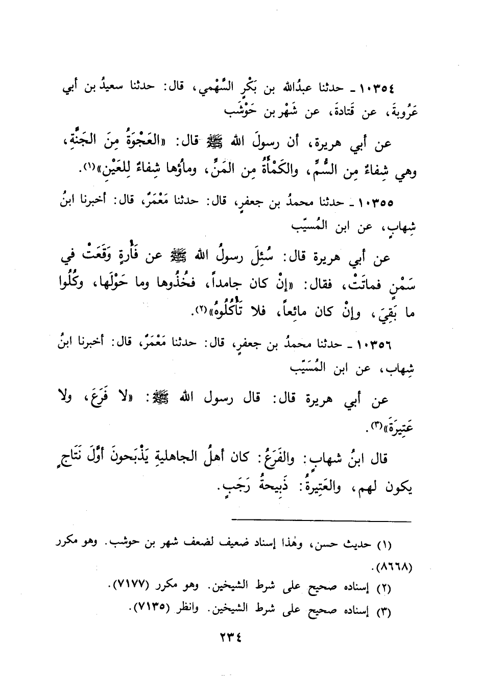 ١٠٣٥٤ - حَدَّثَنَا عَبْدُ اللهِ بْنُ بَكْرٍ السَّهْمِيُّ، قَالَ: حَدَّثَنَا سَعِيدُ بْنُ أَبِي عَرُوبَةَ، عَنْ قَتَادَةَ، عَنْ شَهْرِ بْنِ حَوْشَبٍ، عَنْ أَبِي هُرَيْرَةَ، أَنَّ رَسُولَ اللهِ صَلَّى اللهُ عَلَيْهِ وَسَلَّمَ قَالَ: " الْعَجْوَةُ مِنَ الْجَنَّةِ، وَهِيَ شِفَاءٌ مِنَ السُّمِّ، وَالْكَمْأَةُ مِنَ الْمَنِّ، وَمَاؤُهَا شِفَاءٌ لِلْعَيْنِ " (١)