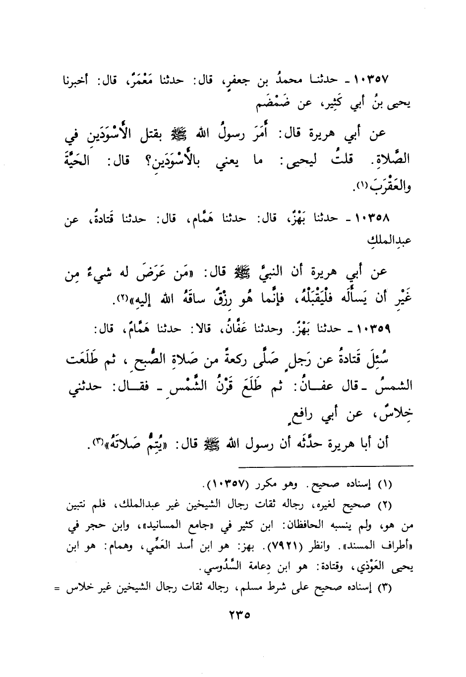 ١٠٣٥٩ - حَدَّثَنَا بَهْزٌ، وَحَدَّثَنَا عَفَّانُ، قَالَا: حَدَّثَنَا هَمَّامٌ، قَالَ: سُئِلَ قَتَادَةُ، عَنْ رَجُلٍ صَلَّى رَكْعَةً مِنْ صَلَاةِ الصُّبْحِ، ثُمَّ طَلَعَتِ الشَّمْسُ - قَالَ عَفَّانُ: ثُمَّ طَلَعَ قَرْنُ الشَّمْسِ - فَقَالَ: حَدَّثَنِي خِلَاسٌ، عَنْ أَبِي رَافِعٍ، أَنَّ أَبَا هُرَيْرَةَ حَدَّثَهُ، أَنَّ رَسُولَ اللهِ صَلَّى اللهُ عَلَيْهِ وَسَلَّمَ قَالَ: " يُتِمُّ صَلَاتَهُ " (٣)