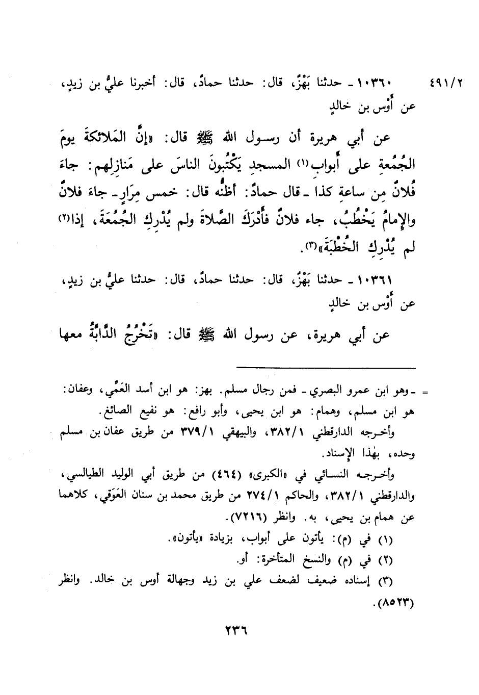 ١٠٣٦٠ - حَدَّثَنَا بَهْزٌ، قَالَ: حَدَّثَنَا حَمَّادٌ، قَالَ: أَخْبَرَنَا عَلِيُّ بْنُ زَيْدٍ، عَنْ أَوْسِ بْنِ خَالِدٍ، عَنْ أَبِي هُرَيْرَةَ، أَنَّ رَسُولَ اللهِ صَلَّى اللهُ عَلَيْهِ وَسَلَّمَ قَالَ: " إِنَّ الْمَلَائِكَةَ يَوْمَ الْجُمُعَةِ يَأْتُونَ عَلَى أَبْوَابِ (١) الْمَسْجِدِ يَكْتُبُونَ النَّاسَ عَلَى مَنَازِلِهِمْ، جَاءَ فُلَانٌ مِنْ سَاعَةِ كَذَا - قَالَ حَمَّادٌ: أَظُنُّهُ قَالَ: خَمْسَ مِرَارٍ - جَاءَ فُلَانٌ وَالْإِمَامُ يَخْطُبُ، جَاءَ فُلَانٌ فَأَدْرَكَ الصَّلَاةَ وَلَمْ يُدْرِكِ الْجُمُعَةَ، إِذَا (٢) لَمْ يُدْرِكِ الْخُطْبَةَ (٣)