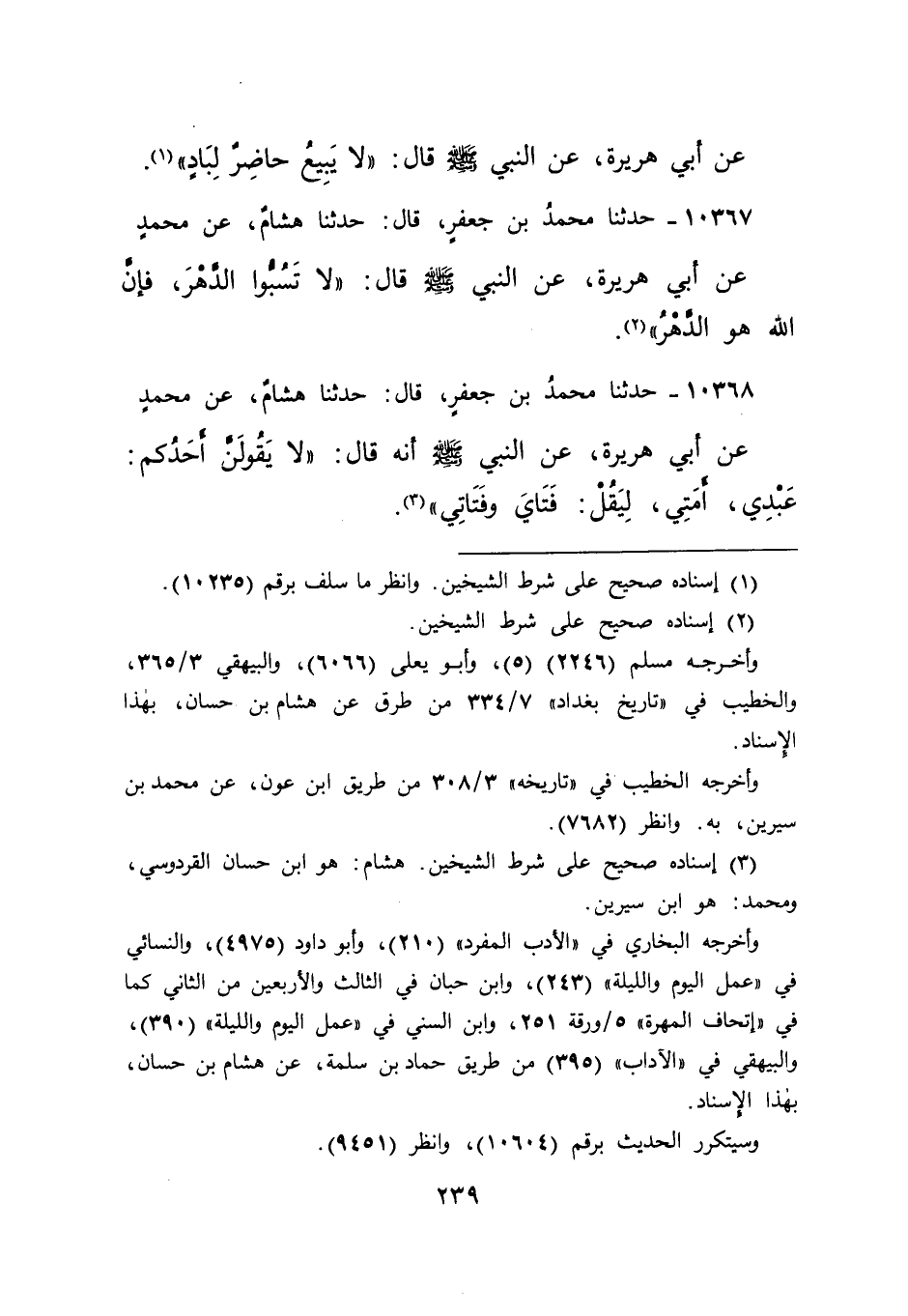 ١٠٣٦٧ - حَدَّثَنَا مُحَمَّدُ بْنُ جَعْفَرٍ، قَالَ: حَدَّثَنَا هِشَامٌ، عَنْ مُحَمَّدٍ، عَنْ أَبِي هُرَيْرَةَ، عَنِ النَّبِيِّ صَلَّى اللهُ عَلَيْهِ وَسَلَّمَ قَالَ: " لَا تَسُبُّوا الدَّهْرَ فَإِنَّ اللهَ هُوَ الدَّهْرُ " (٢)