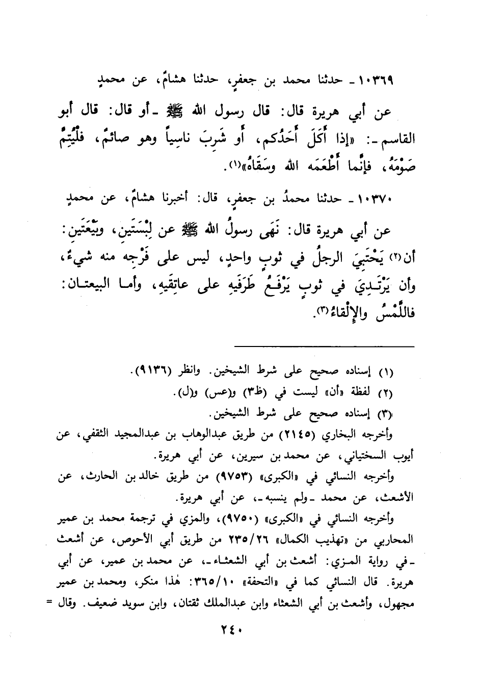 ١٠٣٧٠ - حَدَّثَنَا مُحَمَّدُ بْنُ جَعْفَرٍ، قَالَ: أَخْبَرَنَا هِشَامٌ، عَنْ مُحَمَّدٍ، عَنْ أَبِي هُرَيْرَةَ، قَالَ: " نَهَى رَسُولُ اللهِ صَلَّى اللهُ عَلَيْهِ وَسَلَّمَ عَنْ لِبْسَتَيْنِ، وَبَيْعَتَيْنِ، أَنْ (٢) يَحْتَبِيَ الرَّجُلُ فِي ثَوْبٍ وَاحِدٍ لَيْسَ عَلَى فَرْجِهِ مِنْهُ شَيْءٌ، وَأَنْ يَرْتَدِيَ فِي ثَوْبٍ يَرْفَعُ طَرَفَيْهِ عَلَى عَاتِقِهِ وَأَمَّا الْبَيْعَتَانِ، فَاللَّمْسُ، وَالْإِلْقَاءُ " (٣)