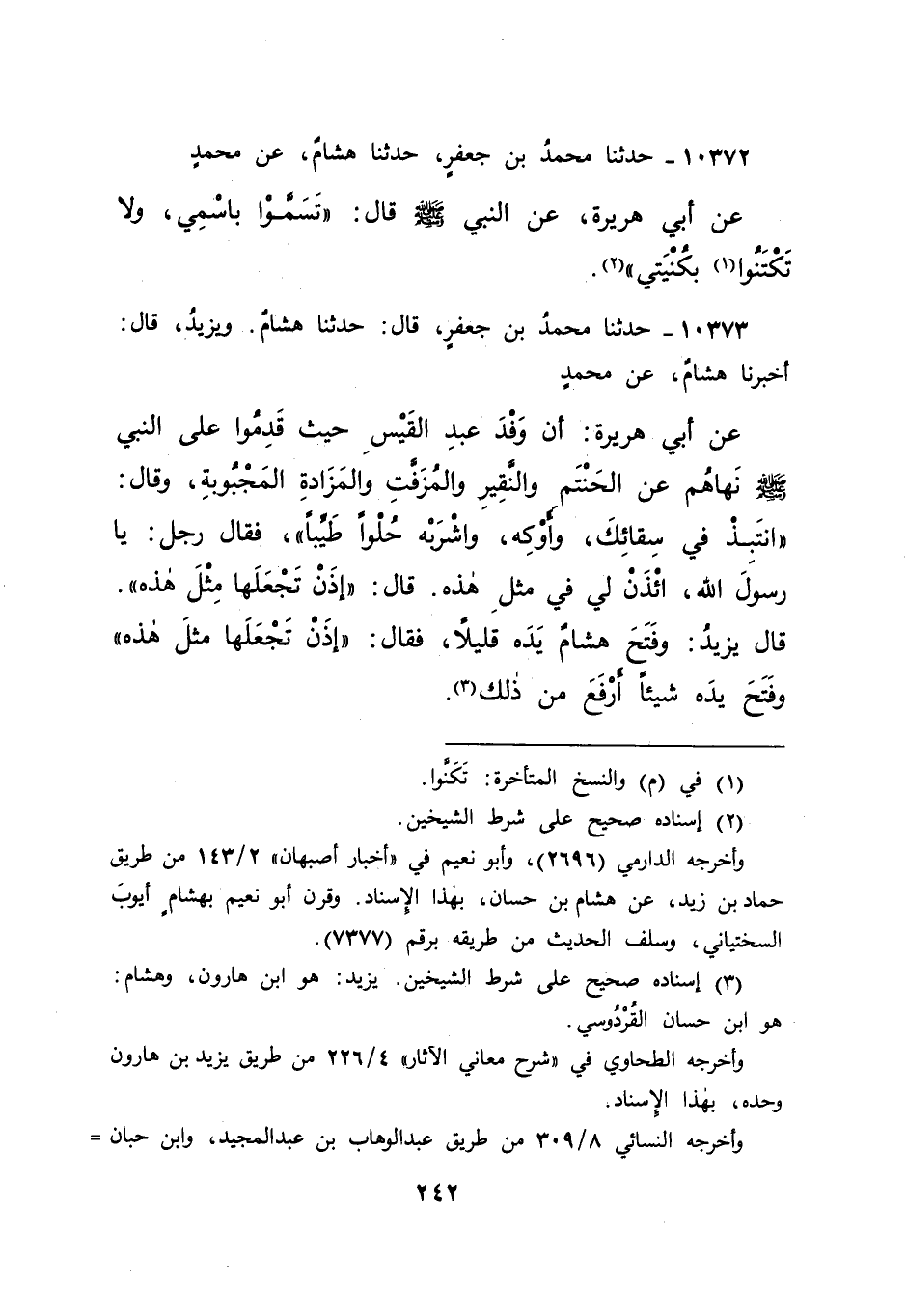 ١٠٣٧٢ - حَدَّثَنَا مُحَمَّدُ بْنُ جَعْفَرٍ، حَدَّثَنَا هِشَامٌ، عَنْ مُحَمَّدٍ، عَنْ أَبِي هُرَيْرَةَ، عَنِ النَّبِيِّ صَلَّى اللهُ عَلَيْهِ وَسَلَّمَ قَالَ: " تَسَمَّوْا بِاسْمِي وَلَا تَكْتَنُوا (١) بِكُنْيَتِي " (٢)