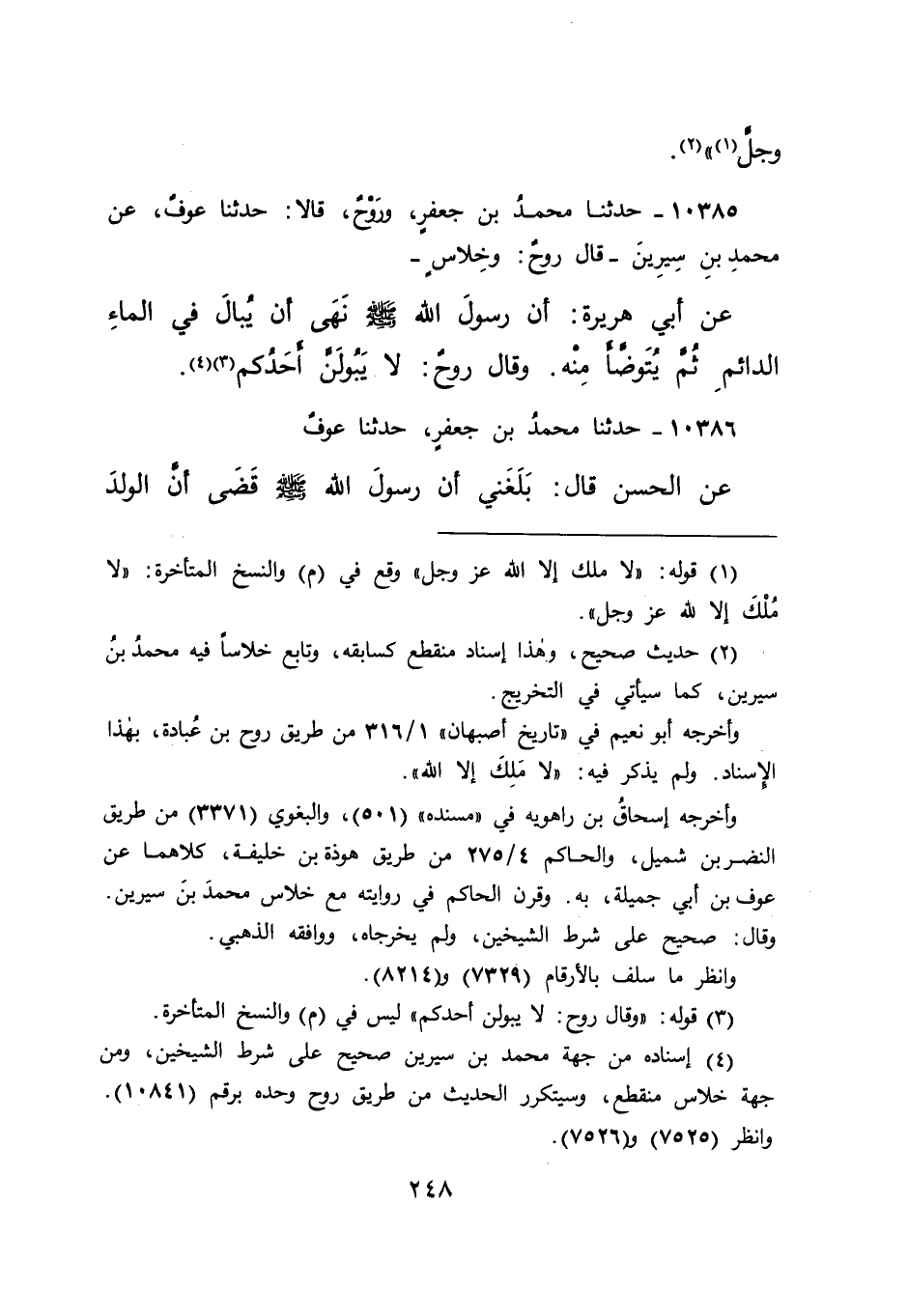 ١٠٣٨٥ - حَدَّثَنَا مُحَمَّدُ بْنُ جَعْفَرٍ، وَرَوْحٌ، قَالَا: حَدَّثَنَا عَوْفٌ، عَنْ مُحَمَّدِ بْنِ سِيرِينَ، قَالَ رَوْحٌ وَخِلَاسٌ عَنْ أَبِي هُرَيْرَةَ، أَنَّ رَسُولَ اللهِ صَلَّى اللهُ عَلَيْهِ وَسَلَّمَ: " نَهَى أَنْ يُبَالَ فِي الْمَاءِ الدَّائِمِ، ثُمَّ يُتَوَضَّأَ مِنْهُ " وَقَالَ رَوْحٌ: " لَا يَبُولَنَّ أَحَدُكُمْ (٣) " (٤)